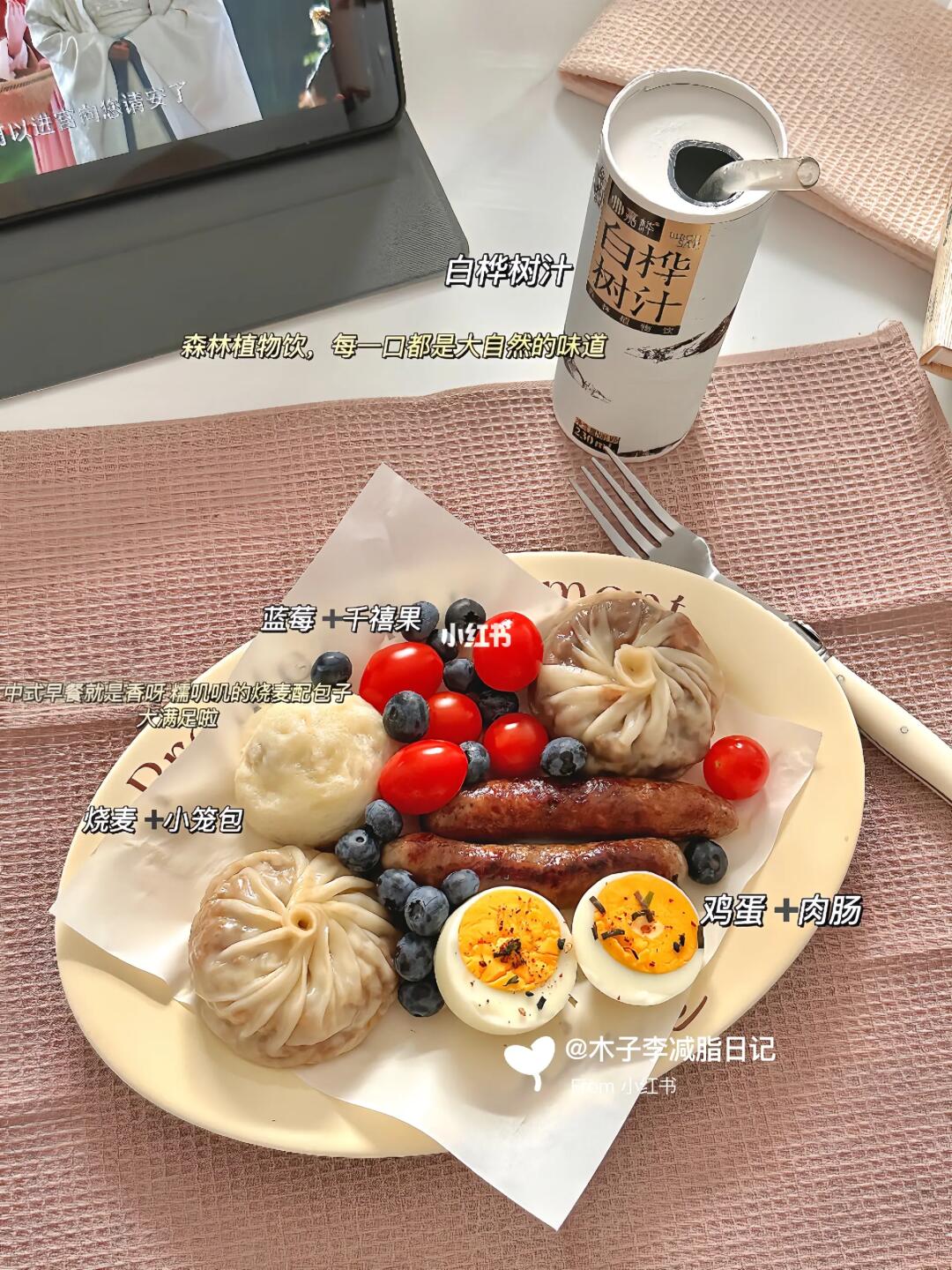 ●原体重:120斤 | 现重:90斤 | 已↓30斤 - 🥣早:白桦树汁 鸡蛋 烧麦 小笼包 蓝莓 千禧果 肉肠 🥣午:蛋黄酥 美式 黄桃 🥣晚:莲藕山药排骨汤 土豆片 - 💭一段时间没吃烧麦啦实在想念了呀 蒸两个又吃了一个小笼包 满足了! 💭饮料喝个来自森林植物饮白桦树汁,口感灰常清爽 回甘,白桦树汁是天然植物饮料 蕴含了60多种人体所需的天然植物营养素,配料也是相当干净了,零添加 没有其他,真滴天然健康无负担!身材管理放心喝!