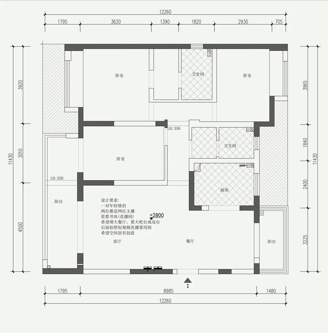 设计要求: 一对年轻情侣 两位都是网红主播 、需要书房(直播间)不考虑客房,朋友聚餐会客 比较多,储藏收纳一定多一些 2、增大餐厅,要大吧台或岛台(可供聚餐) 3、开放式厨房 4、增加多点小场景(方便拍摄)后面拍照短视频 直播要用到 5、卫生间洗手盆尽量大 (女主人是美妆博主) 希望有百变场景(方便拍摄做背景),空间具有创意