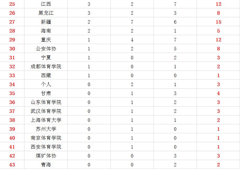 11月16日全部比赛结束后,全运会最新奖牌榜如下: 广东队今天的夺金脚步有所放缓,只拿到3金;但是山东队今天更少,只拿到1金,因此今天的全部比赛结束之后,广东队以34金35银34铜的成绩继续排在第一位;山东队31金35银29铜第2位。 浙江队虽然今天在游泳项目上没有金牌进账,但是在田径、排球、高尔夫赛场上收获了4枚金牌,以27金27银25铜排第3位。 不过和前一天相比,浙江队的优势并没有和第四的拉开,原因就是江苏队今天也收获了4金,26金25银28铜紧咬江苏。 同样在今天收获4金的还有河南和福建。 在最新的奖牌榜上,目前已经有11支代表团的金牌数上双了;有33个代表团有金牌进账;43个代表团有奖牌进账。 明天,也就是11月17日,将会诞生34金,其中游泳是最后一个比赛日了。