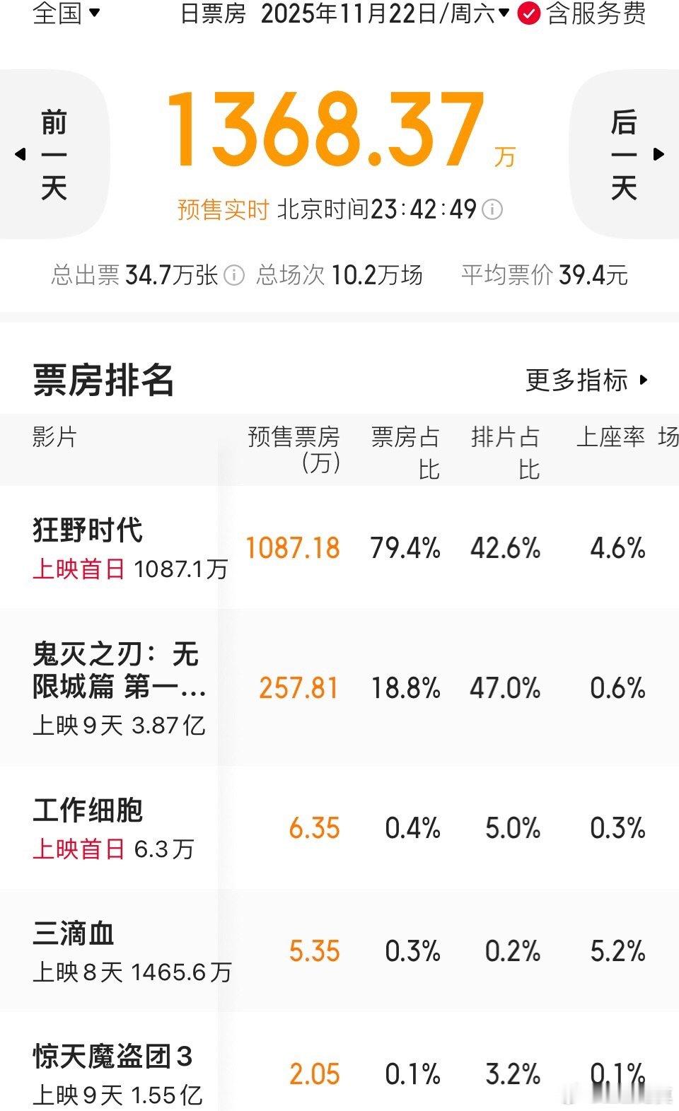 《鬼灭之刃》《惊天魔盗团3》预测票房都有上调。《鬼灭之刃》能否破6亿甚至更高,要看工作日5天的表现了。真正考验粉丝的时候就是这5天。下周六,易烊千玺的《狂野时代》将上映,留给《鬼灭之刃》的时间不多了。