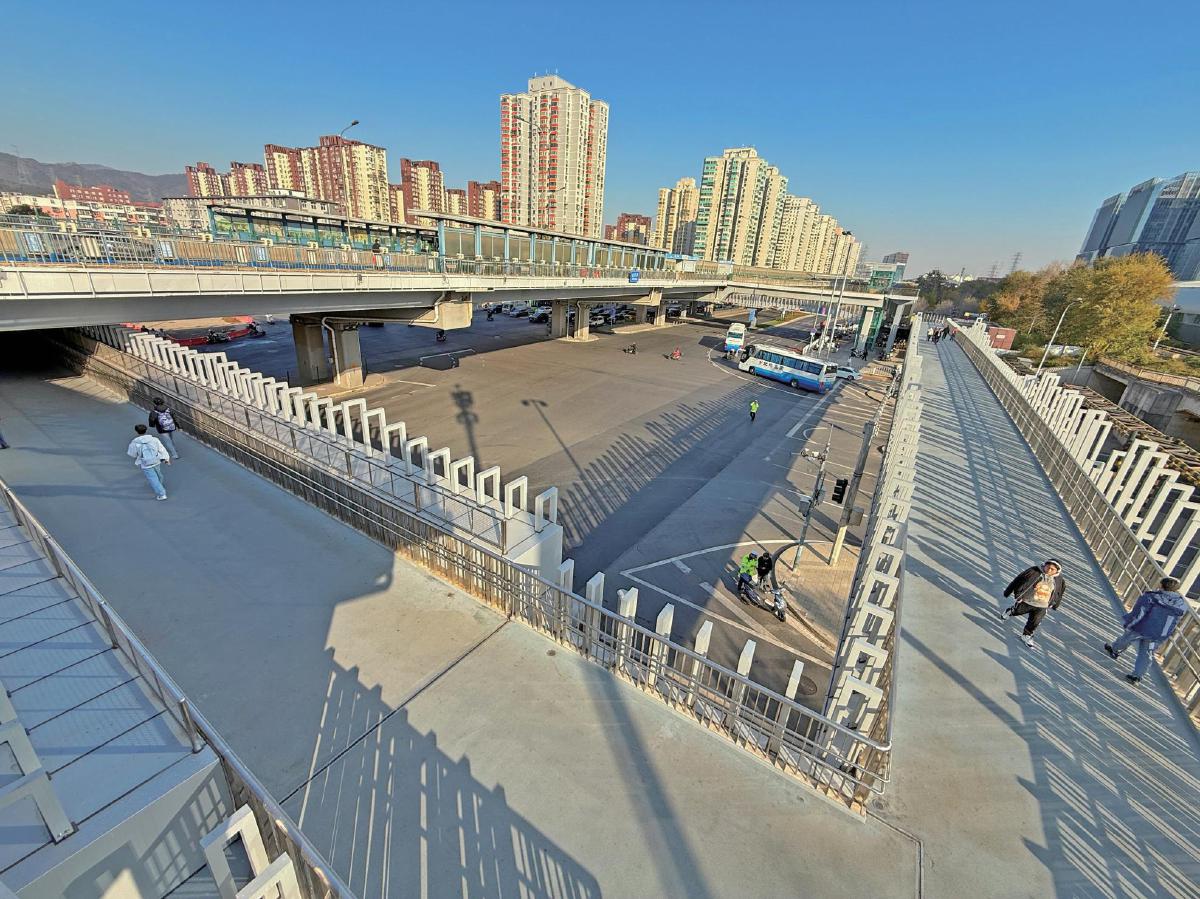 为提升出行效率,项目核心建设了“口”字形钢结构天桥,以实现三维立体换乘。主桥全长421.8米,四条主桥净宽均为4米。建设中融入多项人性化细节:15厘米高台阶、1:12缓坡梯道方便老人通行,8部自动扶梯、4部垂直电梯及盲道设施实现全人群无障碍换乘,塑胶防滑路面、隐蔽式排水槽与1.2米高防护栏杆筑牢安全防线。同步实施的金顶西街步道调整、2000平方米非机动车停放区增设等配套工程,构建起“天桥+步道+停车场”的完整交通体系。