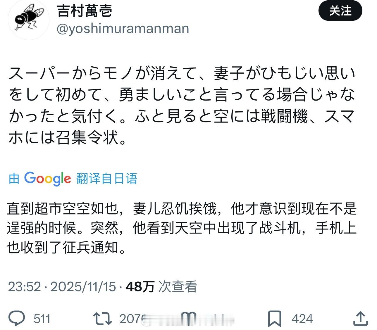 一位日本人说的话获得了大量日本网民的认同:“直到超市空空如也,妻儿忍饥挨饿,他才意识到现在不是逞强的时候。突然,他看到天空中出现了战斗机,手机上也收到了征兵通知。”