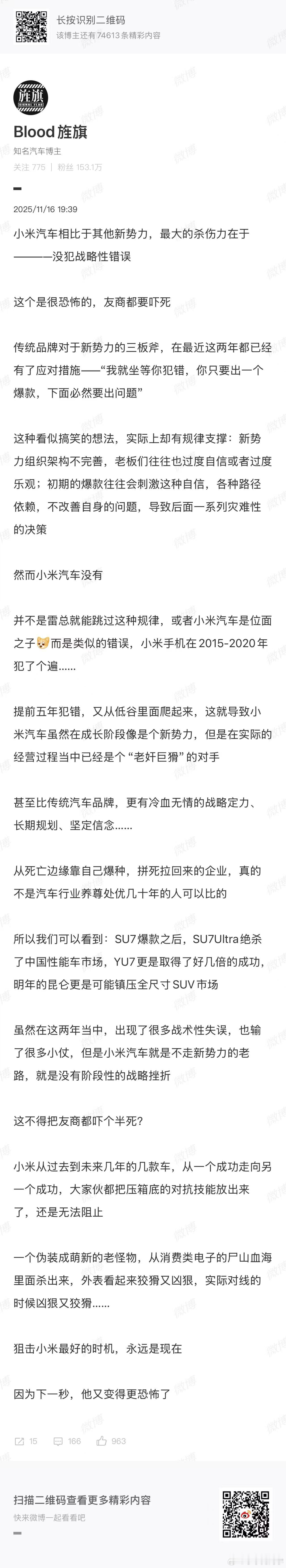 并不是针对小米,我内心还是很尊重小米品牌的。只是这位博主,我们见过他相同的文笔,在大概半年多之前用在另一个品牌上,一模一样。没错,非常熟悉这个文笔,文字之中指点江山,仿佛大产业在他运筹帷幄之中的感觉,还是那种套路,一点没变。太熟悉了……