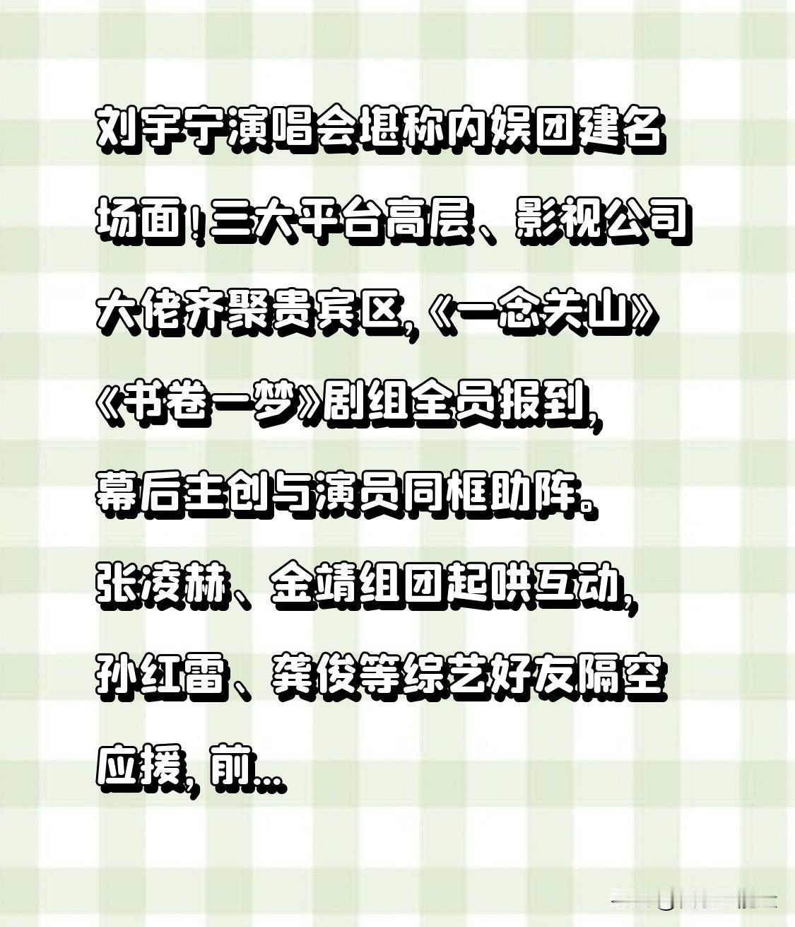 刘宇宁演唱会堪称内娱团建名场面!三大平台高层、影视公司大佬齐聚贵宾区,《一念关山》《书卷一梦》剧组全员报到,幕后主创与演员同框助阵。 张凌赫、金靖组团起哄互动,孙红雷、龚俊等综艺好友隔空应援,前辈后辈欢聚一堂。没有行业壁垒,只有真诚相聚,这满场星光既是对他作品与人品的认可,更是内娱难得的温暖盛况。 需要我帮你整理这场演唱会的完整嘉宾名单,做成清晰的清单吗?