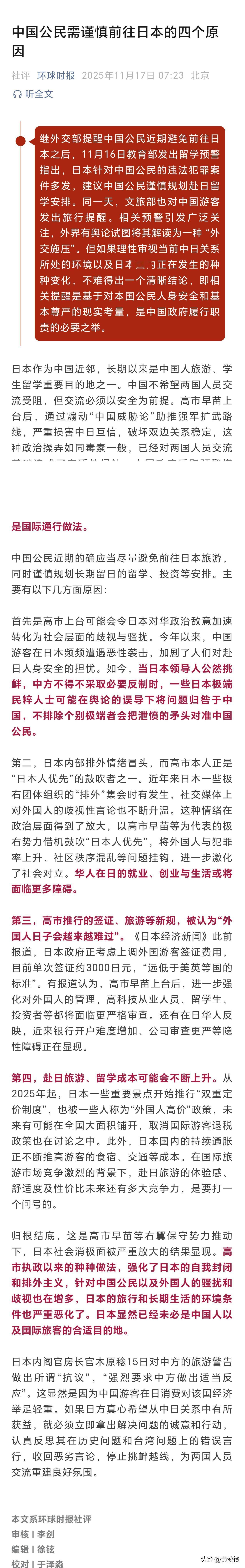 环球时报发表社评 中国公民需谨慎前往日本的四个原因