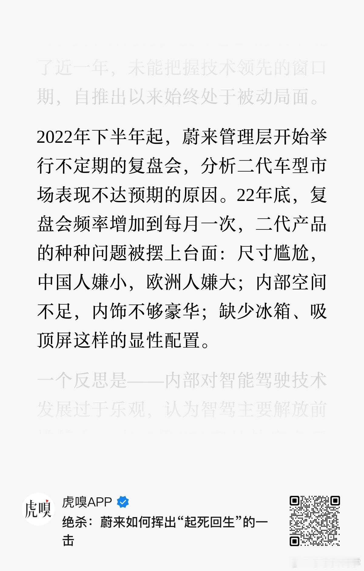 汽车行业都有周期,之前这些大家提意见的,其实早在2022年也就三年前蔚来已经进行过复盘,尺寸问题,内饰豪华感问题,冰沙彩配置问题等等。只不过产品落地不可能那么快,当然也就给了一些民间CEO时间窗口来批判这个事情,树立自己战略专家的人设,最后可能改了也说是他们的功劳。情况就是这么个情况,不过好在熬过去了......