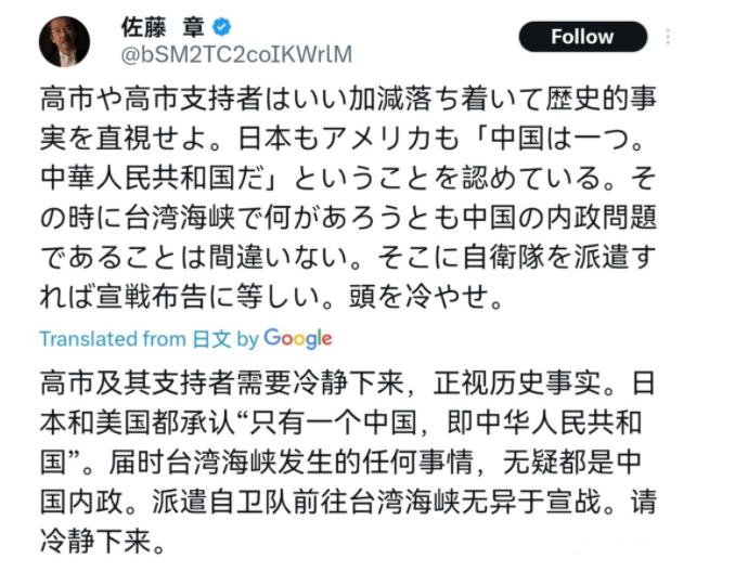 日本国内终于有人出来说实话了!11月16日,曾任朝日新闻记者的佐藤章表示,高市及其支持者需要冷静下来,正视历史事实。日本和美国都承认“只有一个中国,即中华人民共和国”。届时台湾海峡发生的任何事情,无疑都是中国内政。派遣自卫队前往台湾海峡,无异于宣战。请冷静下来。 要知道,不管是日本还是美国,明面上都认“只有一个中国,中华人民共和国才是唯一合法政府”,这可不是随便应付的场面话,是摆上台面的共识。台湾海峡里的事儿,从头至尾都是中国自家的事,跟别的国家半毛钱关系都没有。 日本要是真敢脑子一热,派自卫队往台湾海峡凑,那哪儿是“保护台湾”啊,纯属宣战,这后果日本扛得住吗? 佐藤章更直接,指名道姓说高市早苗:之前她老揪着“要干涉台湾事务”这话不放,要是不把这些话收回去、不撤回那些不妥当的言论,就该立马辞了首相的职位。 这话听着狠,但实在,他看得明白,中国压根没打算对台湾动武,可外国领导人硬要凑过来瞎掺和台湾的事,那就是给日本自己找不痛快,纯粹没事找事。 现在日本国内不少人都脑子发热,连中国为啥一碰到“涉台”话题就反应这么强烈都搞不懂,一个个跟着瞎起哄,完全没意识到踩了红线有多危险。这时候佐藤章站出来说真话,算是难得的清醒人。 他没讲那些绕弯子的大道理,就摆实打实的情况,一个中国是定死的规矩,台湾是中国的一部分,干涉人家内政就是挑事,派自卫队去更是等于宣战,这些都是明摆着的理儿,容不得瞎折腾。 说到底,台湾问题是中国的核心利益,这是碰都不能碰的底线。高市早苗要是还抱着“干涉台湾”的念头不撒手,不光会把中日关系搞得更僵,更是把日本往风险里推。佐藤章这通实在话,就是把最真切的风险摆到了台面上,就看那些脑子发热的人,到底听不听得进去了。