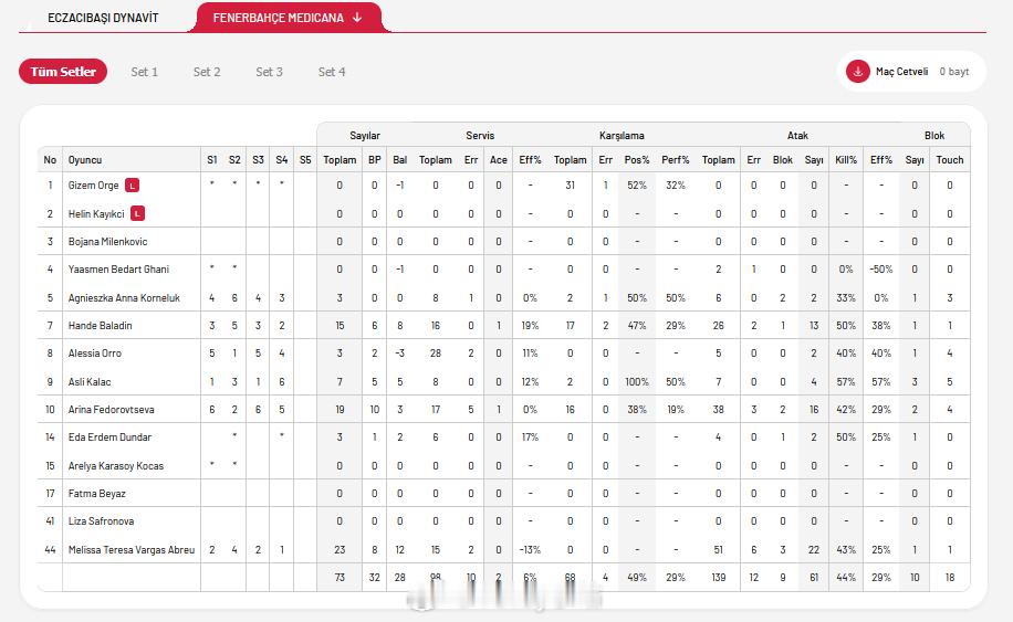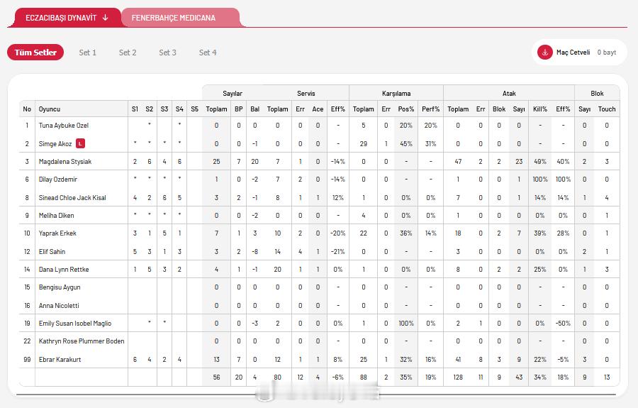 2025-2026赛季土超女排联赛第5轮,费内巴切3-1伊萨奇巴希(25-13 21-25 25-15 28-26)瓦尔加斯23分,51扣22中,6失误3被拦,1拦小彩娃19分,38扣16中,3失误2被拦,2拦1发巴拉丁15分,26扣13中,2失误1被拦,1拦1发卡拉奇7分,7扣4中,0失误0被拦,3拦科尔内卢克3分,6扣2中,0失误2被拦,1拦艾达3分,4扣2中,0失误1被拦,1拦奥罗3分,5扣2中,0失误被拦,1拦斯蒂夏克25分,47扣23中,2失误2被拦,2拦卡拉库尔特13分,41扣9中,8失误3被拦,3拦1发亚普拉克7分,18扣7中,0失误2被拦雷特克4分,8扣2中,0失误2被拦,1拦1发杰克3分,7扣1中,0失误被拦,1拦1发沙辛3分,3扣0中,0失误被拦,2拦1发