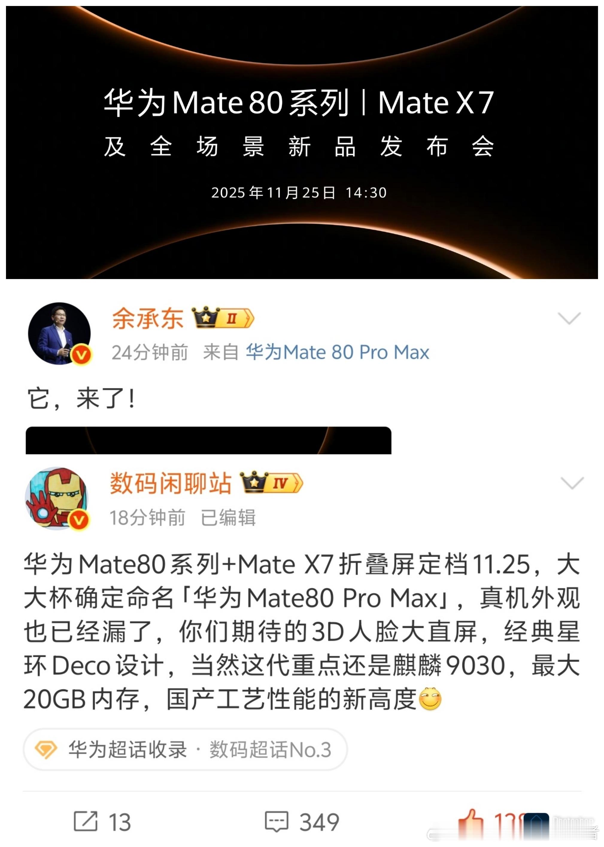 华为Mate80系列及华为MateX7折叠屏手机确认11月25日发布,官方也终于公布外观了。看这个设计,华为Mate80系列有点继承华为Mate40系列的风格,经典的星环Deco设计,镜头模组要大很多,个人觉得背面设计还是很不错的。已经确认的是,华为Mate80 Pro+改名华为Mate80 Pro Max。3D人脸识别全系标配,直屏设计,麒麟9030旗舰芯片,超大杯有20GB内存。这一代产品外围配置全面拉满,标准版用料也挺足的,也算是弥补了之前的一些短板。现在就看它的价格和芯片的体验了,鸿蒙6系统目前也很不错,配合麒麟9030芯片,应该挺能打的。