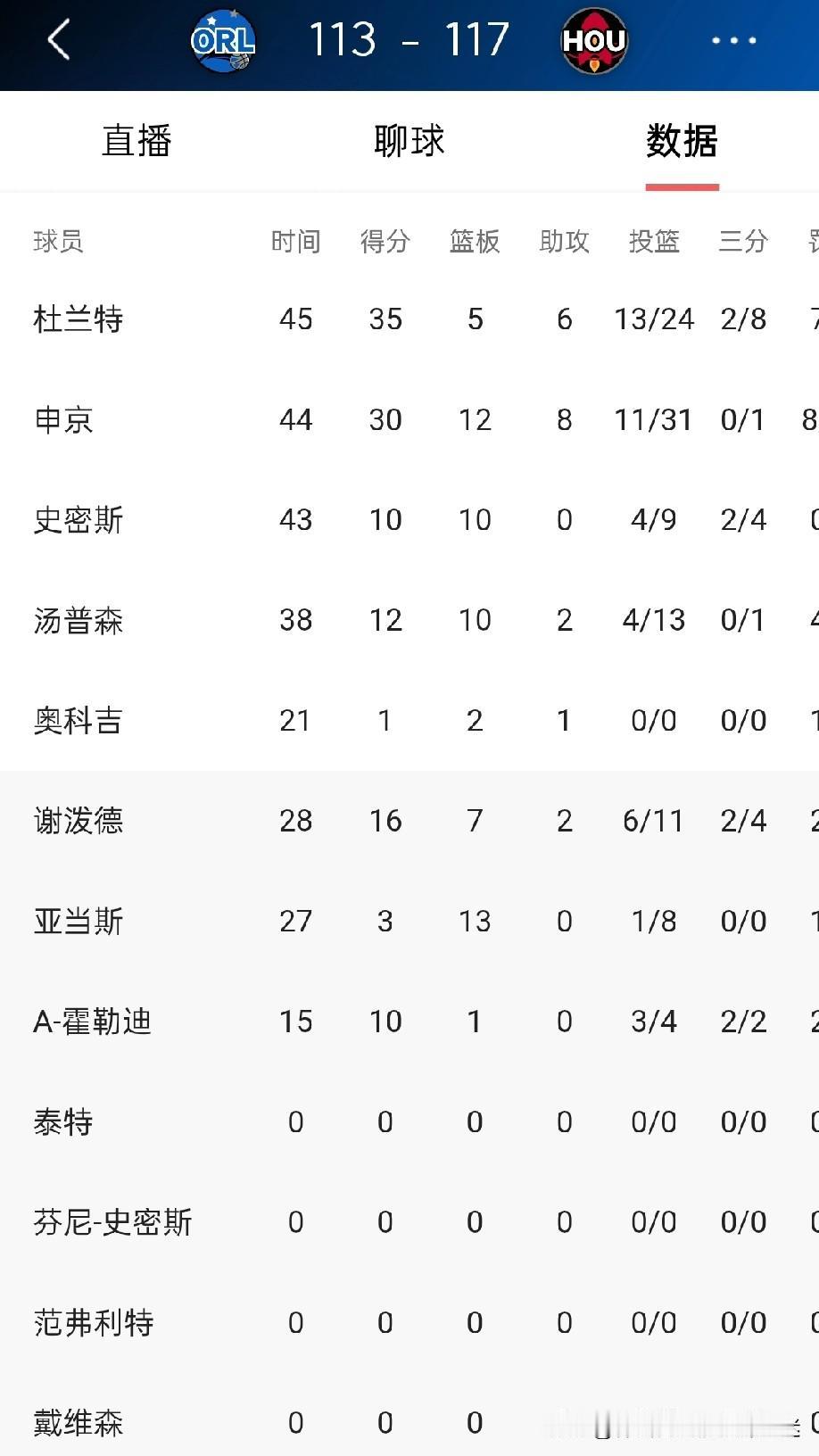 火箭加时117-113战胜魔术,本场比赛杜兰特可是累坏了。全场出场45分钟全队最高,得到35分5篮板6助攻。最后时刻魔术小卡特估计罚球不进将球打进,还好是提前进线。要不真是让火箭白白累了一晚上。