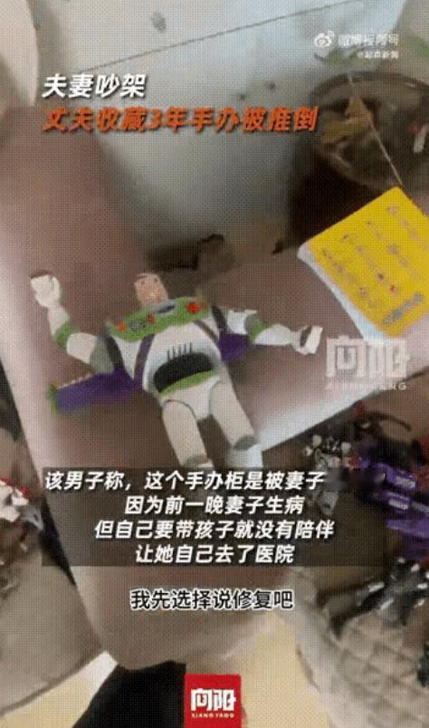 新疆乌鲁木齐,女子生病难受想让丈夫陪自己去医院,可丈夫却拒绝了!女子越想越委屈,把丈夫收藏了3年的手办给推倒了!丈夫看着自己多年的心血被毁坏,一句离婚脱口而出!网友:双方都有点过分,但不至于要离婚! 新疆乌鲁木齐一个普通小区里,一声巨响打破傍晚宁静,玻璃碎裂声紧跟着男人的怒吼,五岁女孩吓得直哭,邻居探头一看,客厅满地手办残骸,夫妻俩正红着眼争执离婚,这不是电视剧桥段,是真实发生的家庭风波。 事儿得从一天前说起,妻子突然头晕恶心,想让丈夫陪去医院,可五岁的女儿正发高烧哭闹,丈夫没法分身,让妻子自己打车就诊,留下照顾孩子。 妻子独自在医院挂号、排队、抽血,折腾到半夜回家,丈夫正忙着给孩子物理降温,只匆匆问了句“没事吧”,注意力又转回孩子身上,委屈压在她心里,没发作。 转天一早,丈夫忙着处理工作订单,有空就擦客厅那排手办柜,却没再问一句妻子的身体,这下妻子彻底崩了,冲丈夫喊:“我在你心里,还不如这些塑料小人?” 丈夫也委屈,觉得自己顾孩子、忙工作都是为了家,两人越吵越凶,妻子情绪上头,冲过去一把推倒手办柜。 “哗啦”一声,玻璃柜门碎满地,那些丈夫攒了三年的宝贝全毁了:省三个月午饭钱买的限量初号机断了胳膊,熬夜拼的千年隼摔散架,初音未来的双马尾滚进玻璃渣。 丈夫当场僵住,蹲在地上捡碎片,手抖得像筛糠,这些不只是玩具,是他每天哄睡孩子后熬夜拼装的寄托,是压力大时唯一的放松出口,总价早超一万块,他抬头盯着妻子,憋出俩字:“离婚!” 这事传到网上,网友吵翻了,有人心疼妻子:“生病时最脆弱,没人陪没人问,换谁都寒心,”有人替丈夫不值:“毁人心头好太伤人,这和砸人饭碗没区别。” 楼下王阿姨看得明白,平时挺恩爱的小两口,怎么就为“玩具”闹到这份上? 其实哪是手办的错。 丈夫觉得赚钱顾家就是尽责,却忘了妻子要的是一句关心;妻子委屈能理解,可偏选最极端的方式发泄,就像有人说的,妻子推的不是柜子,是没被看见的求助信号;丈夫喊的不是离婚,是精神世界被砸烂的崩溃。 后来夫妻俩没真离成,冷静下来,丈夫陪妻子去了医院,妻子红着眼道歉,还偷偷查手办修复方法,粘好的手办留着疤,就像他们的感情,虽没破碎,裂痕也藏不住。 这事儿戳中太多家庭的痛点:过日子哪有绝对对错?怕的是你忙你的责任,我藏我的委屈,谁都不肯先说一句“我需要你”。 手办碎了能粘,人心凉了难暖,家是讲爱的地方,不是比谁更有理的战场,别等冲动毁了一切才想起回头。