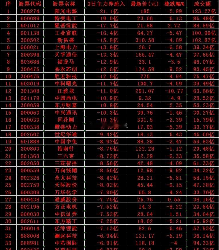 当心!11月17日,前3天主力大幅卖出的35名单阳光电源(300274):3日主力净流入-21.1亿元;特变电工(600089):3日主力净流入-19.5亿元;隆基绿能(601012):3日主力净流入-17.7亿元;工业富联(601138):3日主力净流入-16.4亿元;新易盛(300502):3日主力净流入-15.8亿元;上海电力(600021):3日主力净流入-13.8亿元;天孚通信(300394):3日主力净流入-13.3亿元;福龙马(603686):3日主力净流入-12.9亿元;香农芯创(300475):3日主力净流入-12.6亿元;胜宏科技(300476):3日主力净流入-12.6亿元;中科曙光(603019):3日主力净流入-11.7亿元;江波龙(301308):3日主力净流入-11.0亿元;中国西电(601179):3日主力净流入-10.9亿元;东方财富(300059):3日主力净流入-10.8亿元;中兴通讯(000063):3日主力净流入-10.3亿元。