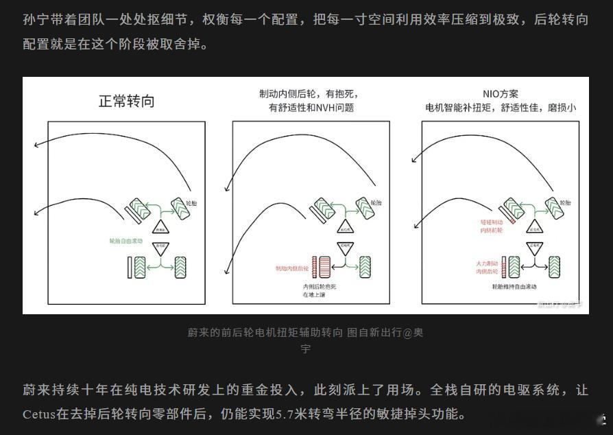 为了获得大空间,把空间效率压缩到极致,蔚来ES8放弃了后轮转向,当然取而代之是落地既有的敏捷掉头功能,而且和行业内用抱死方式实现的路径不同,蔚来方案对于轮胎的磨损小,舒适性高。都说十年纯电技术研发,现在终于派上用场了啊,埋在饭里面的肉终于被大家吃到了......