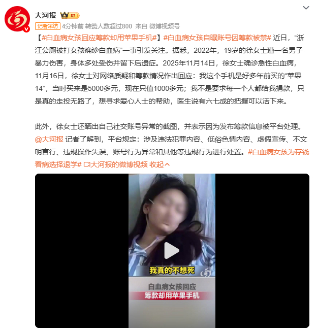 小徐的遭遇太让人心疼,从被打到白血病,命运对她太狠。账号因筹款被禁,她该多无助。网络质疑不该成为救人的阻碍,大家该理性看待,平台也应慎重处理,别让生命在等待中消逝。