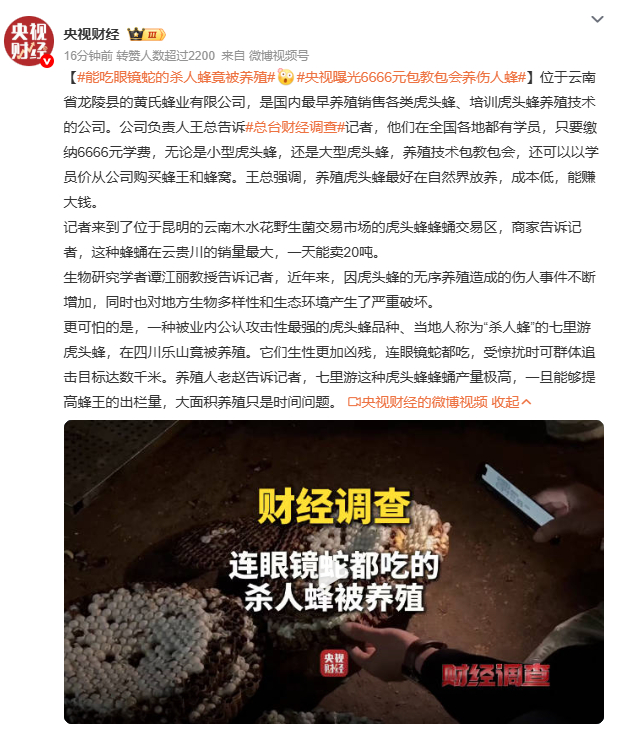 6666 元学养杀人蜂,看似商机实则危机四伏。四川乐山的七里游虎头蜂连眼镜蛇都能捕食,受惊能追人千米,养殖它风险巨大。而蜂蛹市场的火爆,让不少人忽视风险,不顾法规,真希望有关部门尽快出台监管措施!
