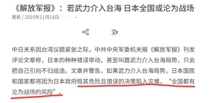 外媒也觉得不寻常!罕见,没见过军报把话说的这么直白的!11月16日,在我们《解放军报》刊文称,若武力介入台海,日本全国或沦为战场之后,没想到这一篇刊文引发了外媒的关注。新加坡的联合早报专门对此进行了报道。很显然,联合早报也注意到,我们军方表现出来的态度是前所未有的。 其实这事儿早有苗头,之前日本首相高市早苗在国会上就扯着嗓子喊,说“台湾有事”说不定就算日本的“生死关头”,意思就是他们可能动武介入。 这可是1945年日本战败后,头一回有日本领导人把“台湾有事”和自己的武力权利绑在一起,还直接放话要动武,这性质多恶劣,不用细说都明白。也正因为她这通狂言,军报才干脆把后果摆到台面上,没给留任何模糊空间。 文章里把账掰扯得明明白白:日本要是真敢伸手,首先自己家周边就得鸡飞狗跳,以前琢磨的“安全圈”全是虚的;更要命的是,别以为仗只在台海打,整个日本都可能被拖进战场;最后这笔历史账更算不清,二战的亏还没吃够,真敢插手,只会再被钉到历史的耻辱柱上。 咱们更是把话挑明了,日本要是不记教训、非要作死,中国肯定往死里揍,这可不是随便说说的场面话,军事专家都点透了,这话背后全是实打实的军事信号,就是杜绝日本有任何瞎琢磨的空间。 可让人摸不着头脑的是,日本哪来的底气敢掺和这事儿?说白了就是算盘打错了,把几张不靠谱的牌当成了靠山。 头一张牌就是死死抱着美国的大腿。这俩最近在军事上黏得越来越紧,12月就要搞第一份“台海出事了怎么联手干”的计划,还打算把美军的导弹部队挪到日本西南的那些小岛上,连“海马斯”火箭炮都备好了。 驻日美军的司令部还要升级,指挥权直接往下放,司令说不定都要升成上将,跟日本自卫队的新司令部对上暗号,这是要把军事绑一块儿,不分你我了。9月份的时候,美日澳新的军舰还凑一块儿闯台海刷存在感,显然是觉得有美国撑着,就敢踩咱们的红线。 再就是日本自己在扩军的路上越跑越偏。这些年不停改安保法案,早就把“只守不攻”的底线踩碎了,2023年更是敲定了新的安保文件,把“主动反击”写进了国策。离台湾才110公里的与那国岛,美军8月刚装了新雷达,日本自己也在石垣岛这些地方堆导弹,摆明了要把西南那些小岛搞成“炮楼”。兜里刚有俩破武器,就真当自己能跟中国叫板了? 最关键的是,他们对历史的认知全是歪的。高市早苗说那话不是嘴瓢,背后是日本右翼想把二战后的规矩掀了的野心。连日本人自己都不买账,上百人跑到首相官邸抗议,《朝日新闻》也批她“瞎搞,添乱”,可见这事儿连他们自己人都觉得悬。可这帮政客就是揣着明白装糊涂,忘了当年侵略的账还没算清,现在又想在台湾问题上搞小动作。 要清楚,台湾是中国的命根子,这红线谁碰谁倒霉。军报把话说这么透,就是给日本敲响警钟:别存侥幸心理,台海不是你能撒野的地方,二战定的规矩也不是你能随便改的。真敢豁出去,“迎头痛击”可不是说着玩的,到时候日本只会落个玩火自焚的下场,这点必须让它看明白。