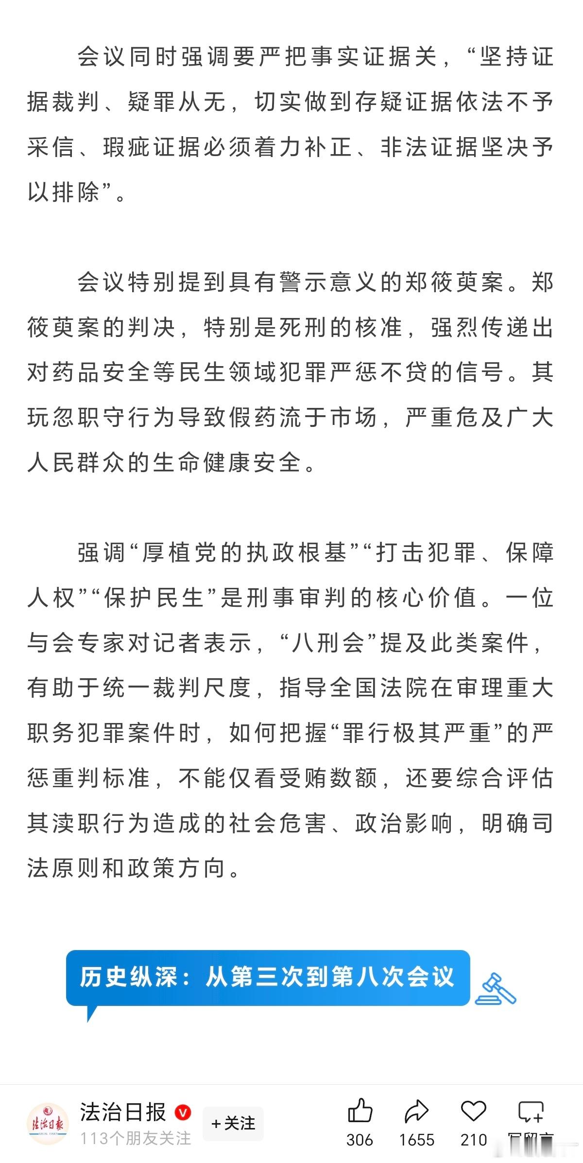 “……(八刑会)同时强调,要严把事实证据关,“坚持证据裁判、疑罪从无,切实做到存疑证据依法不予采信、瑕疵证据必须着力补正、非法证据坚决予以排除”。 ”