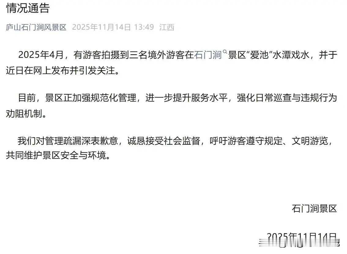 2025年4月,江西庐山石门涧景区“爱池”水潭,三名印度游客脱衣下水、互相搓背,还把救生圈当玩具,留下满地香皂泡。视频11月曝光后,景区才通报“属实,管理有疏漏”。 从印度游客在庐山瀑布下“泡澡”,再回看最近一连串的“高能画面”:深圳地铁里,有人徒手挖咖喱饭,油点子溅得座椅斑驳;上海外滩,几位老哥赤脚盘腿一坐,自动清场出“真空地带”;广州街头网传“就地解决”,成都洒红节彩粉漫天,地面像被调色盘砸过;如今又添一笔,把“严禁下水”告示当空气。每一条都在公共文明的神经上蹦迪。 另外引人关注的是,有人竟借空壳公司之名骗取工作签证,暗中非法滞留。深圳近日一举查封37家此类企业,这种公然踩线的行径,绝非一句“文化差异”就能开脱。 我们这片锦绣河山,连踩块石头都心疼,更遑论下水洗澡随意糟蹋了。我觉得这不是松弛感,是没规矩;不是文化差异,是不懂得尊重!尊重中国的公共规则、尊重他人的生活空间。这是自然保护区,不是恒河浴场! 作为普通人,我不排斥文化碰撞,但底线是相互尊重。既然来了,请把分寸一起带来!就得遵守中国的规矩、敬畏他人的日常呼吸。别越界、别打扰,不能以邻为壑。 盼日后惩戒条款亮出牙齿,无论护照颜色,犯规即埋单。包容有尺,非无底线之纵;尊重有价,需彼此共赴。 朋友们你们觉得是不是这个道理?欢迎评论区聊聊自己的看法。 [图源网络]