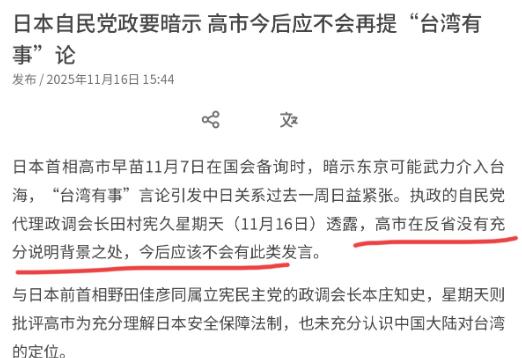 高市早苗态度变软了,找人给中方喊话,希望中国给一个台阶下!在我们多方严厉警告,要求高市早苗撤回恶劣言论之后,日本政府终于意识到事态严重性了。11月16日,根据外媒报道,因高市早苗言论引发中日关系急剧紧张之后,执政的自民党代理政调会长田村宪久出来放消息了。田村宪久称,高市在反省没有充分说明背景之处,今后应该不会有此类发言。   很显然,在日本政府最少两次表示不撤回相关言论之后,这一次,日本方面口风有变化了。常理推断,田村宪久如果没有得到授意,恐怕也不会出来释放这一个消息。   某种程度来说,日本是希望通过软化立场,让我们给高市早苗一个台阶下,给当下两国的紧张关系降温。不过,日本态度有软化,但是在我们看来其缓和关系的诚意明显不足。   高市早苗只承认自己“没有充分说明背景”,对涉台错误言论本身的危害性避而不谈,更没提撤回言论或者公开道歉。中方当初的要求很明确,就是让她收回那些干涉中国内政的话,现在她避重就轻打太极,这哪是真心认错?分明是想蒙混过关。   11月7号众议院预算委员会上,有人问“台湾有事”是否属于日本可行使集体自卫权的“存亡危机事态”,高市早苗直接给出肯定答案,说涉及武力行使就可能符合这一情形。   要知道台湾是中国不可分割的一部分,这是国际社会公认的事实。一个日本政要公然把中国内政和日本的军事权利绑在一起,这已经不是简单的口误,而是赤裸裸的干涉内政。   面对中方的严厉警告,日本政府一开始硬气得很。11月10号高市早苗自己在国会辩解,说这话是“最坏情况的假设”,还声称和政府以往立场一致,明着拒绝撤回。   日本官方长官木原稔后来接受采访,也只是含糊其辞说“日中沟通很重要”,对中方要求撤回言论的核心诉求完全回避。他们当时大概觉得,随便说几句场面话就能应付过去。   可中方这次根本没给他们敷衍的机会。外交部和驻日使领馆率先发声,提醒中国公民近期避免前往日本,已在日人员要加强自我保护。   教育部紧跟着发布留学预警,建议大家谨慎规划赴日留学安排。多家航司也迅速响应,涉及日本航线的客票都支持免费退改。   这一连串措施直接戳中了日本的要害。中国游客一直是日本旅游业的核心客源,要是大家都不去了,日本的酒店、商场、景点肯定得面临经营压力。   更让日本政府坐不住的是经济领域的隐忧,。有日本内部人士透露,他们特别怕中方后续会出台稀土出口管制等措施,这对依赖稀土的日本制造业来说,简直是致命打击。   日本国内的反对声也越来越大。立宪民主党的本庄知史直接公开批评高市早苗,说她对安全保障相关法律理解不充分,对台湾问题的认知也存在严重偏差。   龙谷大学教授松岛泰胜更是直接呼吁,要求高市早苗撤回言论、公开道歉并辞职,不然日本的院校和旅游相关企业都会遭受难以挽回的损失。   内外压力之下,日本政府才不得不松口。田村宪久作为自民党代理政调会长,他出来放消息肯定经过了高层默许,不然没人敢随便代表执政党发声。   可他们选的这个表态方式,实在没多少诚意。不说撤回错误言论,不提公开道歉,只说“今后不会有此类发言”,这是想让中方假装之前的事没发生过?   中方在乎的不是她以后说不说,而是现在必须纠正已经犯下的错误。她的言论已经严重破坏了中日关系的政治基础,不撤回不道歉,就意味着日本方面根本没认识到问题的严重性。   更有意思的是,日本还在悄悄打小算盘。有消息说他们想借G20峰会的机会和中方沟通,但外务省自己都承认,目前没有任何定论,后续发展根本不确定。   这种“既要想缓和关系,又不肯付出实际代价”的心态,大家都看得明明白白。想让中方给台阶下,自己却连最基本的诚意都不肯拿出来,天下哪有这么好的事?   中日关系走到现在这步,完全是日本方面一手造成的。高市早苗的错误言论不是偶然,而是日本国内历史修正主义抬头的必然结果。   中方的强硬回应,本质上是对日本这种系统性右倾化的严厉预警。如果日本真的想缓和关系,光靠田村宪久喊几句软话远远不够。   高市早苗必须正式撤回涉台错误言论,公开承认自己的错误,这才是修复关系的第一步。不然的话,中方的相关措施只会继续保持,日本最终损害的还是自己的经济利益和地区安全环境。   现在所有人都在看着日本接下来的行动。是真的知错就改,拿出实实在在的诚意,还是继续用模糊的表态敷衍了事?时间会给出答案,但中方维护核心利益的决心,从来不会有任何动摇。