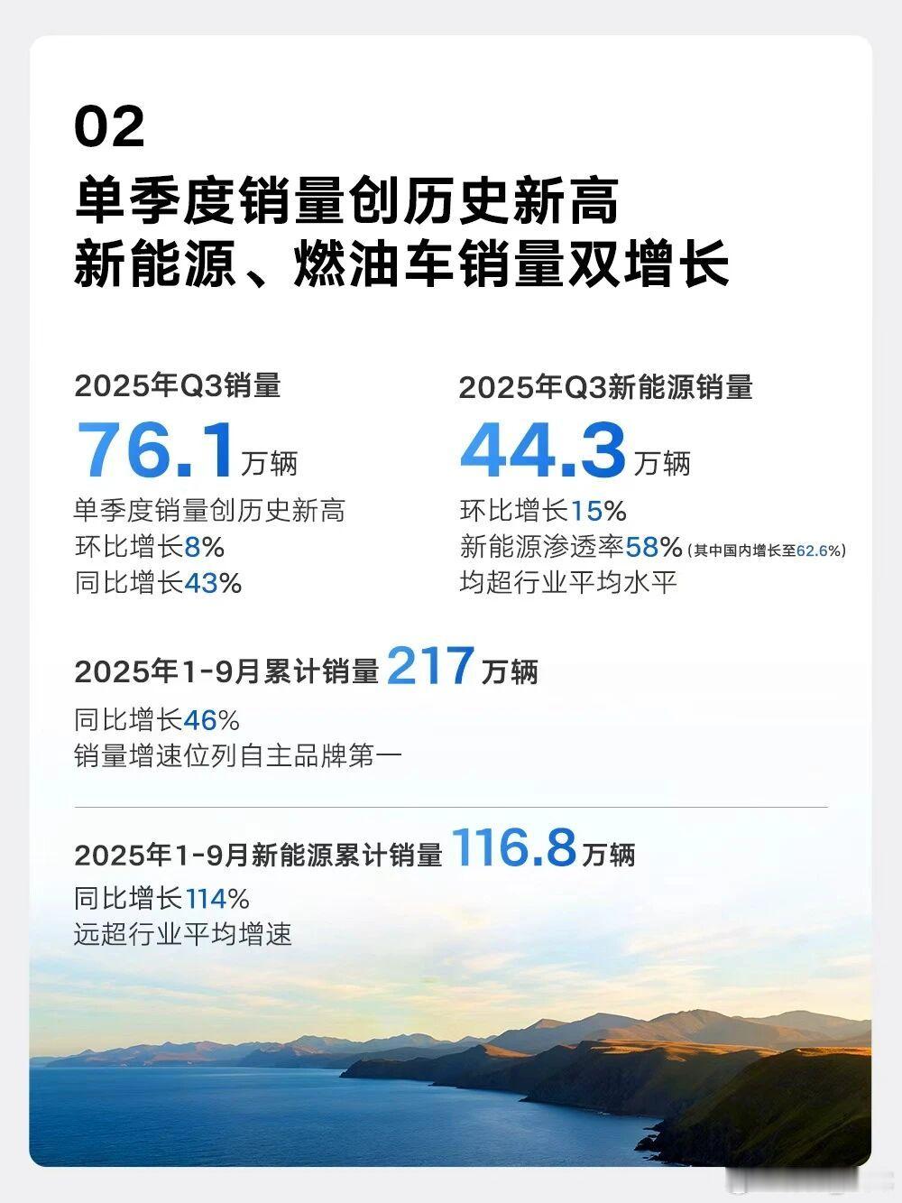 给一台高速行驶的汽车更换发动机,吉利居然做到了。台州宣言之后,吉利开启了规模宏大的整合行动,过去撒出去的摊子,愣是在一年内全部收了收回来。各个业务条线在降本增效、关停并转的背景下,依旧保持了高速增长。今年七月,吉利宣布鉴于「今年迄今为止的强劲销售表现」,将 2025 年全年销量指引从 271 万辆上调至 300 万辆。当时大家都非常意外。可是到Q3一看,直接交出一份几乎无短板的业绩:集团1-9月销量217万,全年300万不是白日做梦;吉利银河10个月实现100万销量;燃油车连续第9年保持自主销冠,同比增长18.8%;出口业务也开始有了起色。战略指引战术,真的很强。