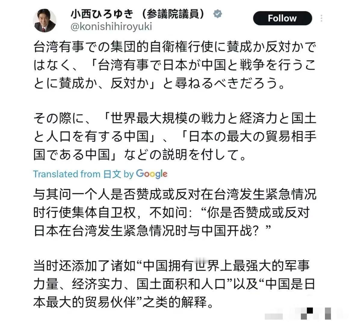 日本国内有人出来说实话了!11月17日,日本参议员小西洋之表示,高市首相“在台湾海峡发生紧急情况时,对中国行使集体自卫权”违反了《日本与中华人民共和国和平友好条约》。因为缔约双方确认,根据上述原则和《联合国宪章》的原则,它们应以和平方式解决彼此关系中的一切争端,并且不应诉诸武力或以武力相威胁。 “您支持日本对中国开战吗?”日本参议员小西洋之在国会抛出这个问题时,现场一片沉默。这不是危言耸听,而是对首相高市早苗近期涉台言论的直接拷问。 小西洋之没有绕弯子,而是把模糊的法律术语拉回现实:“别谈什么‘集体自卫权’,直接说——你是不是赞成日本主动对华动武?”在他看来,任何讨论都必须建立在基本事实之上:中国是世界第二大经济体、拥有全球规模最大的常备军、国土面积是日本的25倍以上,同时还是日本连续16年的最大贸易伙伴。这些不是数据堆砌,而是决定国家命运的关键变量。 过去十天里,高市早苗始终拒绝撤回那番危险言论,反而有部分政客为其辩护,称这是“维护区域稳定”。但小西洋之的发言像一记清醒剂——真正的稳定,从来不是靠挑衅换来的。如果日本真按高市设想的路径行动,等于单方面撕毁两国关系的政治基石,把几十年积累的信任与合作推向悬崖。 让我担心的是,这种将战争选项轻率化的倾向,正在掩盖一个残酷现实:一旦中日因台海问题兵戎相见,日本承受的代价远超想象。举两个具体例子:一是2024年中日双边贸易额高达3520亿美元,日本汽车、电子、机械三大支柱产业严重依赖中国市场;丰田在华年销量超180万辆,占其全球销量近三成。二是日本所需的重稀土元素(如镝、铽)90%以上来自中国,这些材料是制造混合动力车电机、风力发电机和精密制导系统的核心原料。一旦供应链中断,日本高端制造业将面临瘫痪风险。 再看安全层面。即便不比较整体军力,仅从地理上看,冲绳距离台湾不到700公里,横须贺、佐世保等美日联合基地均在解放军常规导弹覆盖范围内。美国战略与国际研究中心(CSIS)近年多次兵棋推演显示,在台海冲突场景下,日本本土军事设施极可能在冲突初期遭受大规模打击。这种风险,是东京能承受的吗? 小西洋之的可贵之处,在于他没有陷入“强硬派”与“软弱派”的标签之争,而是回归条约文本与国家利益本身。他提醒国人:外交不是演讲比赛,领导人的一句话,可能让千万家庭陷入战火。高市早苗或许想用“存亡危机事态”彰显决断力,但她忘了,《和平友好条约》本身就是日本战后最成功的外交成果之一——它让两国在冷战高峰时期也能保持对话,让经济合作成为压舱石。 我觉得,真正的勇气不是喊打喊杀,而是在喧嚣中守住底线。小西洋之说出的不是“反对意见”,而是被遗忘的常识:与中国为敌,不符合日本的根本利益。如果连这样的声音都被淹没在民族主义口号里,那才真正危险。 一个明显的问题是:当政治人物把“假设性开战”当作筹码时,谁来为普通民众的饭碗、企业的订单、孩子的未来负责?和平不是理所当然的,它需要清醒的头脑去守护。 各位读者你们怎么看?欢迎在评论区讨论。