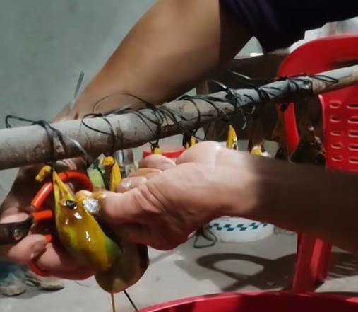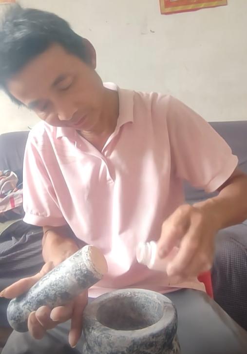 大家知道这些是什么吗?这是我们猪身上的一个部位,叫做猪苦胆。我们把它拿回家后,先用绳子把它吊起来,然后用剪刀在这里(指着某个部位)剪个口子,剪开后我们就可以把石灰塞进去。如果胆子比较大,还要把胆汁挤出来一点。看,这样挤出来一点,里面就空了一些。然后把石灰装满,这样每个猪胆都要灌满石灰。 我们这样做完之后,把这些放在室内,静置沉淀一年。在这期间,要避免阳光直射,这样才行。你看这些猪胆,刚做出来的,它们的表皮是白色的。沉淀的时间越长,表皮就越白,能量也就更强。这时候,它们已经吸收了石灰和猪苦胆的成分。 等沉淀一年后,我们就把它们放进石臼里捣成细粉。捣碎后,还会加上一些“灵魂香料”来调味。看,我们这样调配好之后,准备好了就可以使用了。 比如我们有时候会遇到羊长脓包的情况。对于这些脓包,我们先用抹布把脓包清理干净,把脏东西挤出来。然后,把调好的猪苦胆撒到伤口上,就能促进愈合了。一次撒下去,伤口就能去腐生新肉,效果非常好。