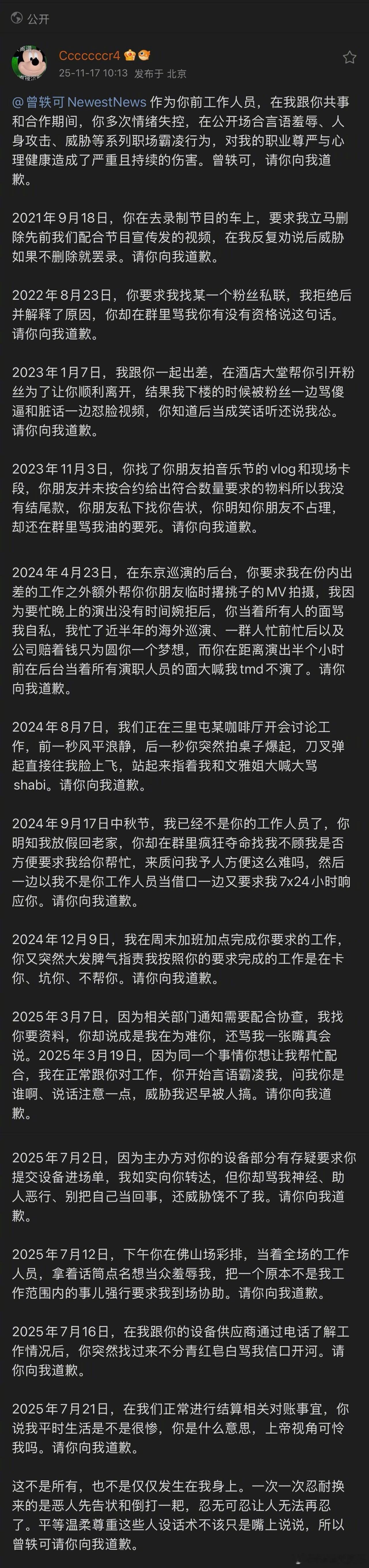 打工人声讨曾轶可,认为曾轶可在巡演期间不配合宣传,还爆料与曾轶可共事时,经常被曾轶可语言暴力。于是,这位工作人员请求曾轶可向他道歉。