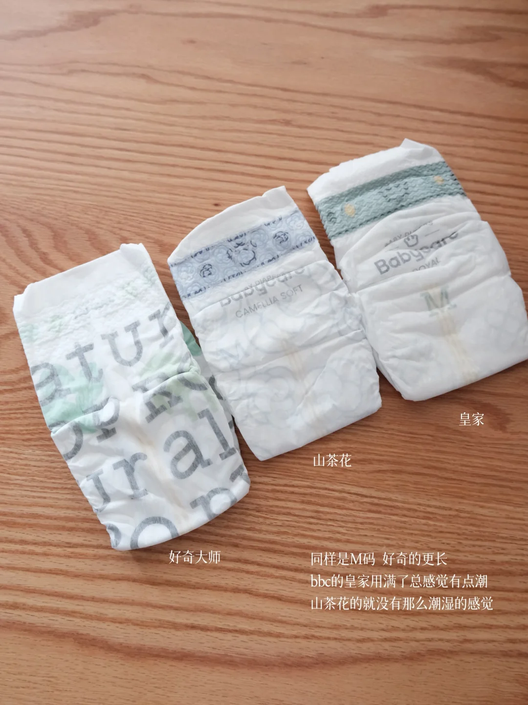拿捏不准宝宝的pp适合哪种,那就来个试用装。一直都是用bbc的纸尿裤,一月用了air,二月用皇家,总结下来就是当纸尿裤兜不住好几次,不是偶然,就是要换大一码了。用皇家的体会是,满当当的时候总感觉衣服都顺带变潮,潮湿的感觉不是很好,反而山茶花就不会。