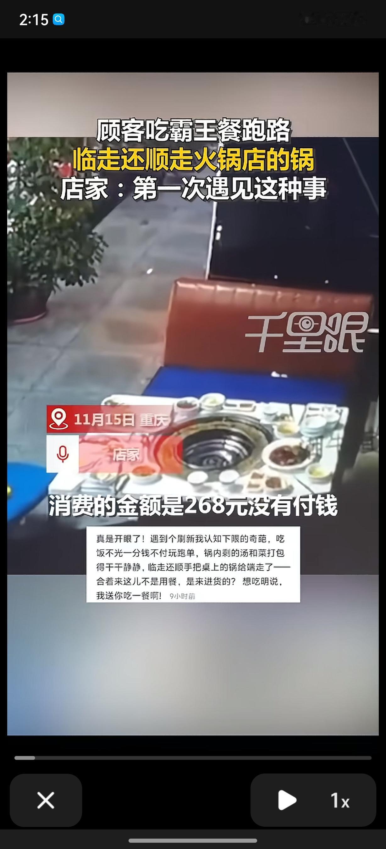 重庆,一家火锅店内,有客人消费了268元,未买单便径直离开,还在门口顺走了其他餐桌上的火锅。 他的动作一气呵成,毫无胆怯之意。 当时火锅店生意火爆,服务员没留意到客人离开。等发现客人逃单,调取监控后才发现其还顺走了一个锅。 火锅店老板已报警。 这位客人难道不清楚店里有监控吗?很快就会被找到的。 既白吃又白拿,这样的人着实少见。 客人此举,虽让火锅店损失不大,但小事见人品。一个爱占便宜、惯于顺手牵羊之人,走到哪儿都不会受欢迎。 来源:西安中院