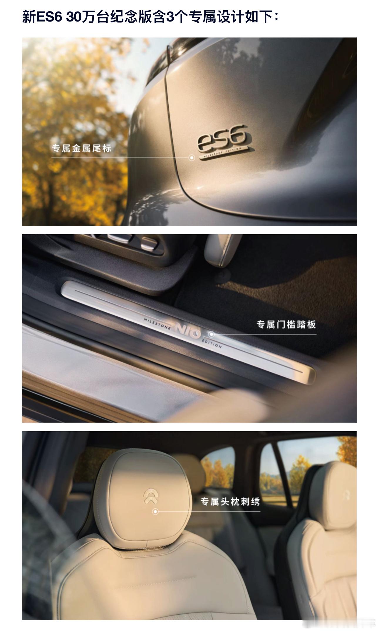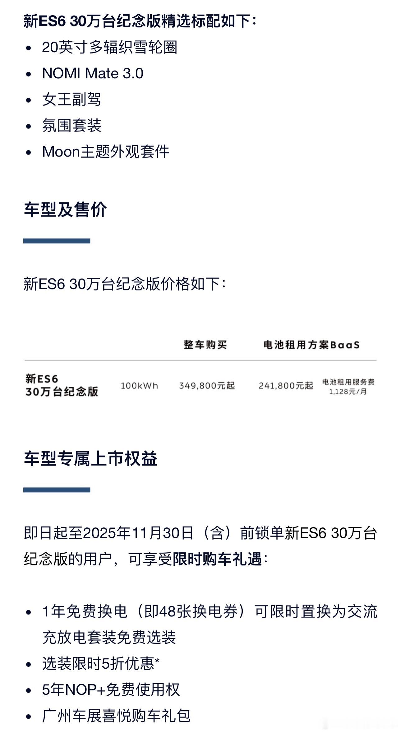 【蔚来新ES6纪念版】整车售价34.98万元,租电售价24.18万元;比标准版贵11800元,包含这几个标配项目:女王副驾(选配价4250),氛围套装(选配价1500),NOMI Mate 3.0(选配价2450),Moon主题外观套件(选配价2250),20英寸多辐织雪轮圈(选配价1750)。