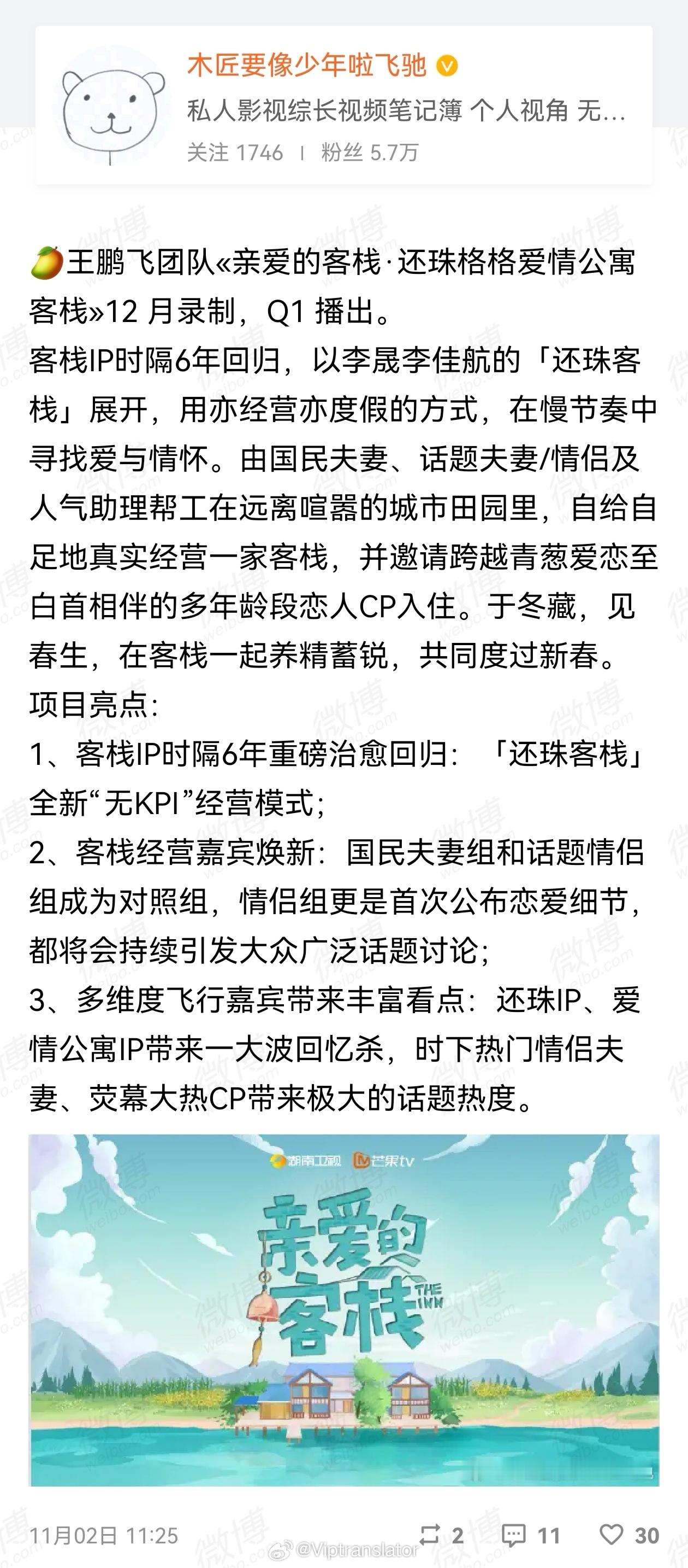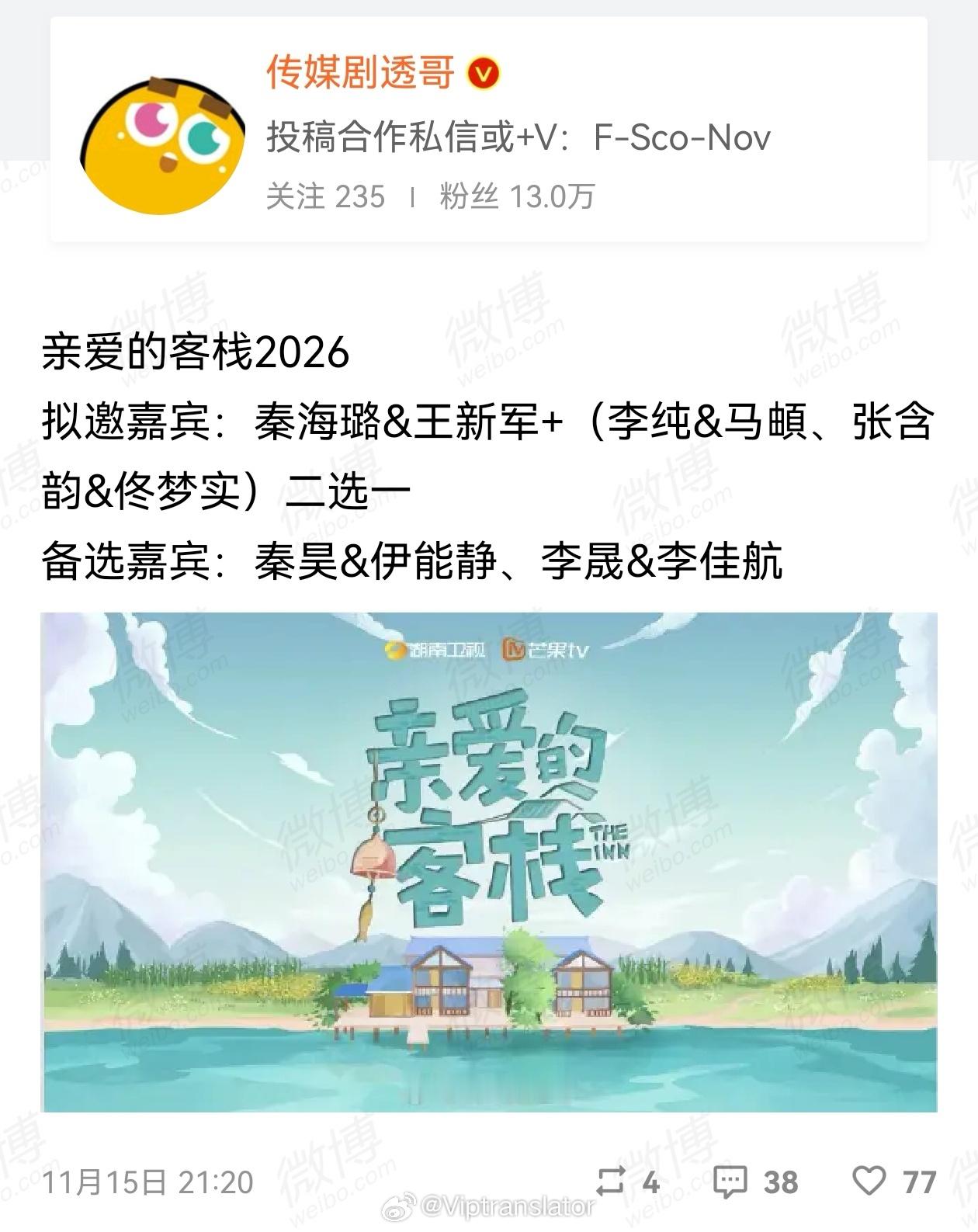 亲爱的客栈4从1.0版本李晟李佳航夫妻,传到2.0版本秦海璐王新军夫妻,传到现在是3.0版本王鹤棣+一位大热剧花常驻。12月即将开录。消息应该比较稳,因为王鹤棣12月也不进组。播出从12月的周五十点档移至2月的周六十点档播出。