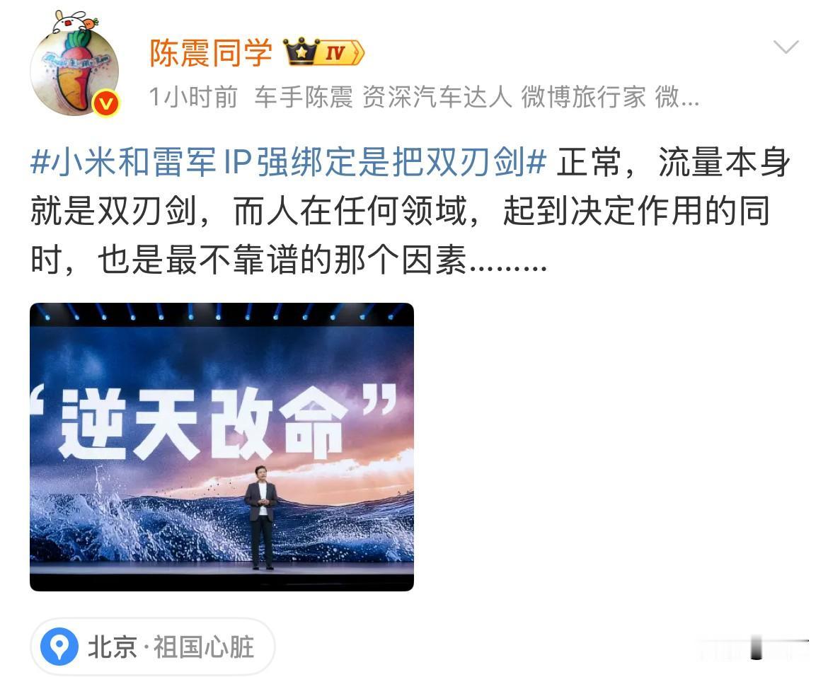 陈震评小米和雷军IP强绑定是把双刃剑! 就刚才,陈震在社交网络上讨论关于企业家和企业IP绑定的现象,在他看来,人才是不稳定的因素,但也是最关键的因素。 其实 在互联网时代,不仅仅是汽车这个行业,越来越多的企业家会与他们的产品进行绑定,在其他任何行业都有这个现象。 大家经常看到的小网红,能够火起来,也能够快速地塌房,在一定程度上也是这种产品与人IP绑定之后产生的后果。 在互联网时代,他本身就是一个注意力吸引经济,包括陈震本人,其实他吃饭的方式,本质上和这些企业家也是一样的,大家都是靠着个人来推动产品或者服务的买卖。 所以当消费者在使用这个产品的过程当中,碰到问题的时候,会因为出现一些问题怪罪在这个人身上,所以怎么样要做好IP与产品的关系,在互联网时代还真的是一个难题。 很多企业包括很多企业家,他们不愿意抛头露面,把自己的名声与自己的产品绑定起来,包括李想他接受采访的时候也讨论过这个问题 他自己其实也不想做自己产品的代言人。 而是要想办法让消费者冲着他的产品去,而不是人去,他认为这样才是持续稳定发展的关键。