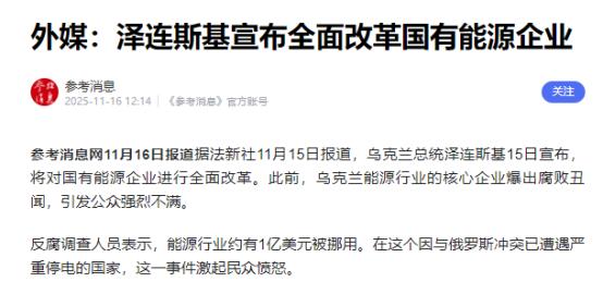 乌克兰方面正式宣布了   乌克兰总统泽连斯基刚在社交媒体宣布,要彻底改革国有能源企业。这次改革既要查账本,还要调整管理层。   他这话不是空喊口号,就在宣布改革前几天,乌克兰反腐败部门刚捅出个大窟窿。调查人员查到了一个能源领域的窝案,涉案的钱差不多有1亿美元。这群人把政府给能源企业的合同当成了摇钱树,每笔合同都要抽10%到15%的回扣。   而最让乌克兰人炸锅的是这个腐败团伙的头头,是泽连斯基当年在影视圈打拼时的合伙人明迪奇。明迪奇仗着这层关系,在能源系统里安插了一大堆自己人。他们不仅操控人事任免,还把贪来的钱通过各种路子转到国外,非洲、中东都有这些赃款的影子,甚至有部分流去了莫斯科。   明迪奇倒是机灵,他提前收到风声,在反腐败部门上门前几小时就溜了。调查人员最后查到,他已经跑到了以色列。这波操作彻底点燃了民众的怒火,大家都在问,战时能源这么紧张,高层怎么敢这么贪。   泽连斯基的反应还算快,他第一时间就和这个老搭档切割,直接宣布冻结明迪奇在乌克兰的所有资产和银行账户。紧接着被牵扯进来的现任能源部长格林丘克和前能源部长、现司法部长加卢申科,都主动递交了辞呈。泽连斯基在视频讲话里说得很坚决,能源领域的腐败绝对不能忍。   这次改革就是他给出的具体回应,他专门拉着总理和经济部长一起敲定了改革路线,每个企业都有明确的整改时间表。国家原子能公司要在一周内准备好新监事会的组建工作。水力能源公司得马上启动CEO的竞聘,同时把监事会完善好。   天然气运输系统运营商的动作要更快,得同步完成监事会改组和总经理竞聘。石油天然气公司的新监事会竞聘也得抓紧,确保明年1月就能完成交接。其他大型国有能源企业,都要跟着更新由国家委派的监事。   当然光调整人还不够,政府已经明确,会联动执法部门和反腐机构一起行动,全程盯着改革过程。国家审计部门也会介入,仔细核查每一家能源企业的预算使用情况,确保财务报告的每一个数字都真实可信。   泽连斯基这么急着动真格,不光是为了平息国内民愤。乌克兰现在全靠西方援助撑着,可这起腐败案让美欧国家都坐不住了。德国政府直接表示,他们对这件事非常担忧,毕竟德国给乌克兰能源行业的支持一直不少。   欧盟更是把话说得很明白,反腐败是乌克兰加入欧盟的核心要求,基辅必须拿出强硬行动。美国媒体也在质疑,给乌克兰的援助会不会都被这样挪用。这些声音让泽连斯基压力巨大,他必须用改革成果证明,乌克兰值得信任。   要知道,乌克兰的腐败问题早就不是秘密了。透明国际的报告显示,乌克兰在全球清廉指数上只拿到35分,是欧洲腐败最严重的国家之一。能源领域更是重灾区,有核安全专家就直言,国家原子能公司的高层就是一群掠夺者。   现在战场形势本就不乐观,俄军还在加紧打击能源设施。这个冬天,不少低收入家庭都要在寒冷中度过。乌克兰人现在看得很明白,前线士兵在流血,后方要是有人还在吸能源领域的血,这个国家就真的没希望了。泽连斯基的改革能不能落到实处,大家都在盯着。