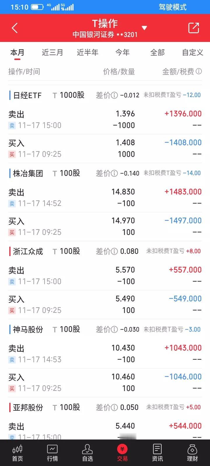 2025.11.17,今天t了11只股票,2只etf,今天做t盈亏相抵,赚476