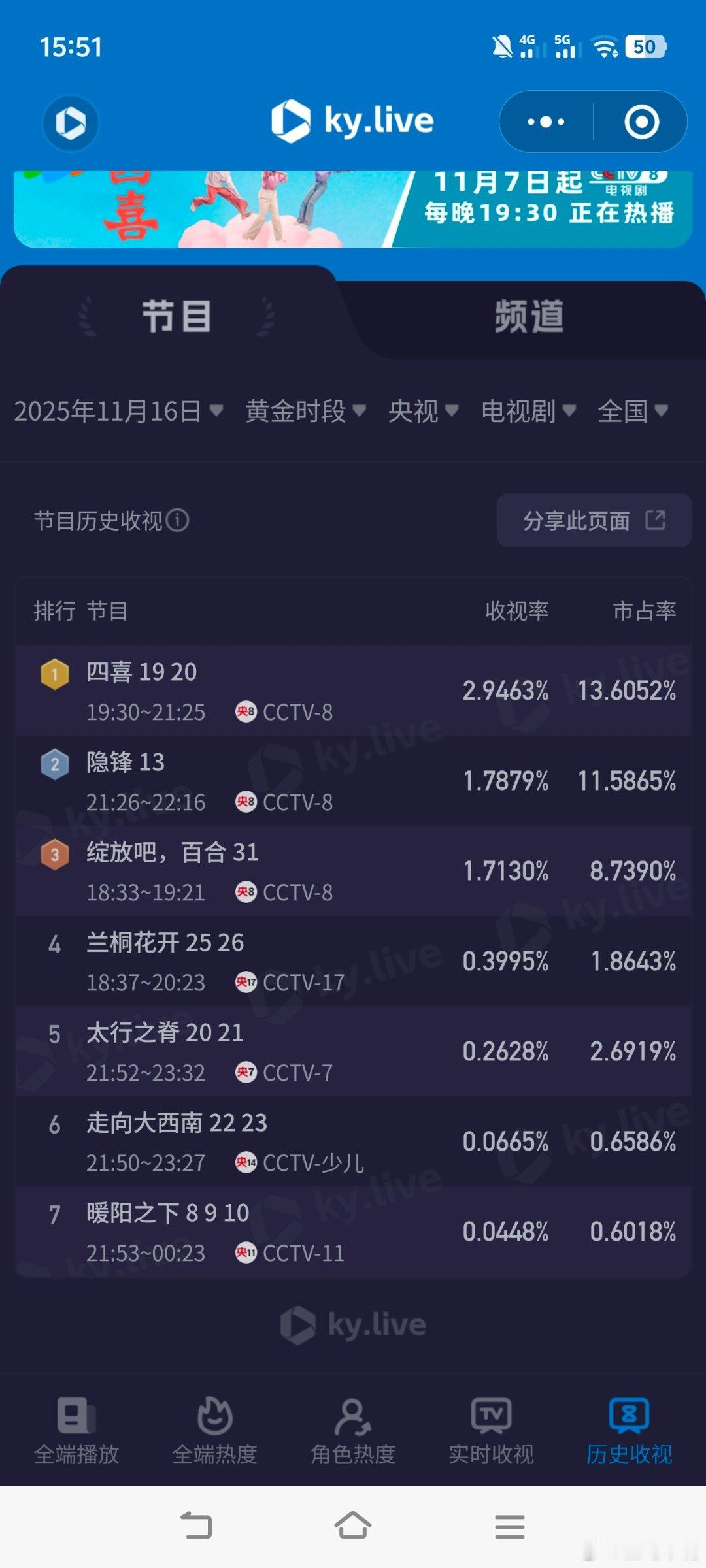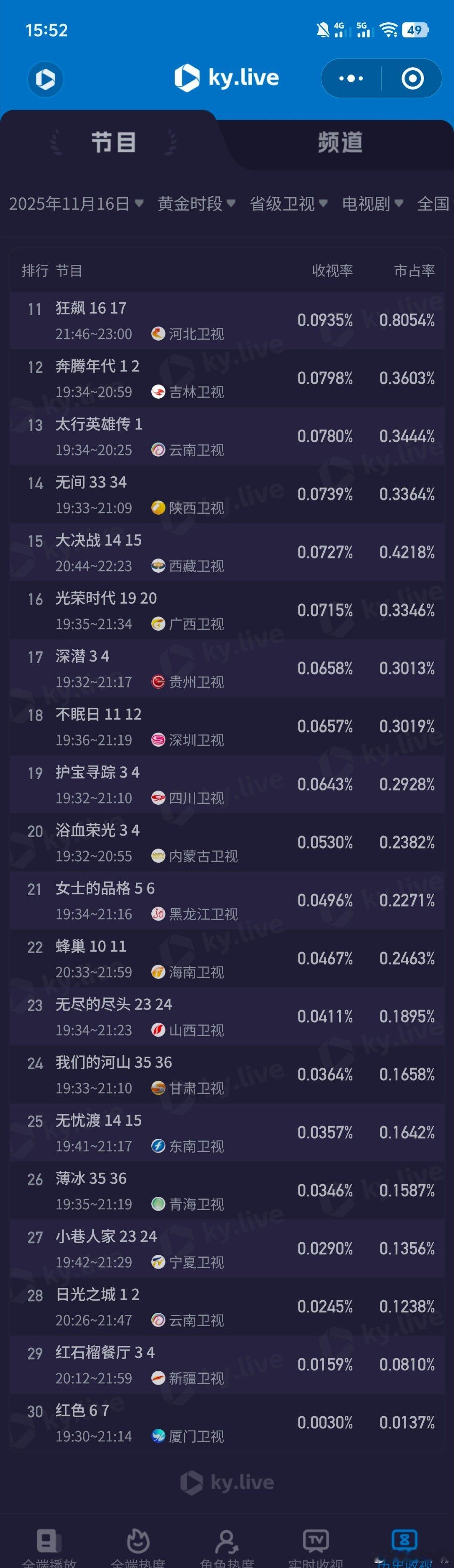 11月16日cvb收视日报四喜2.346,酷云2.9463,系数0.796隐锋1