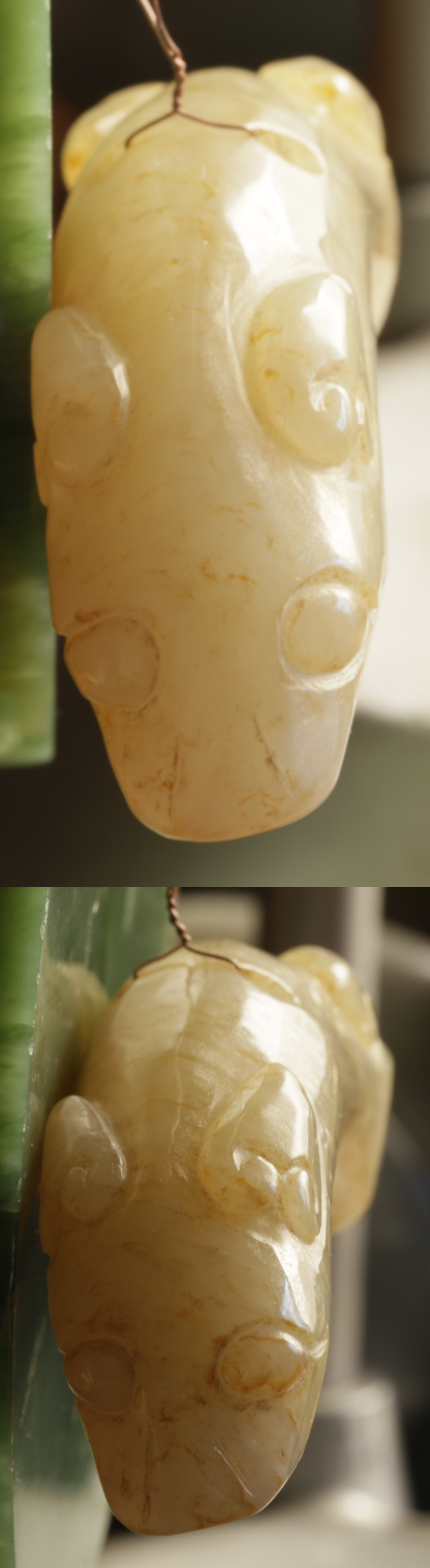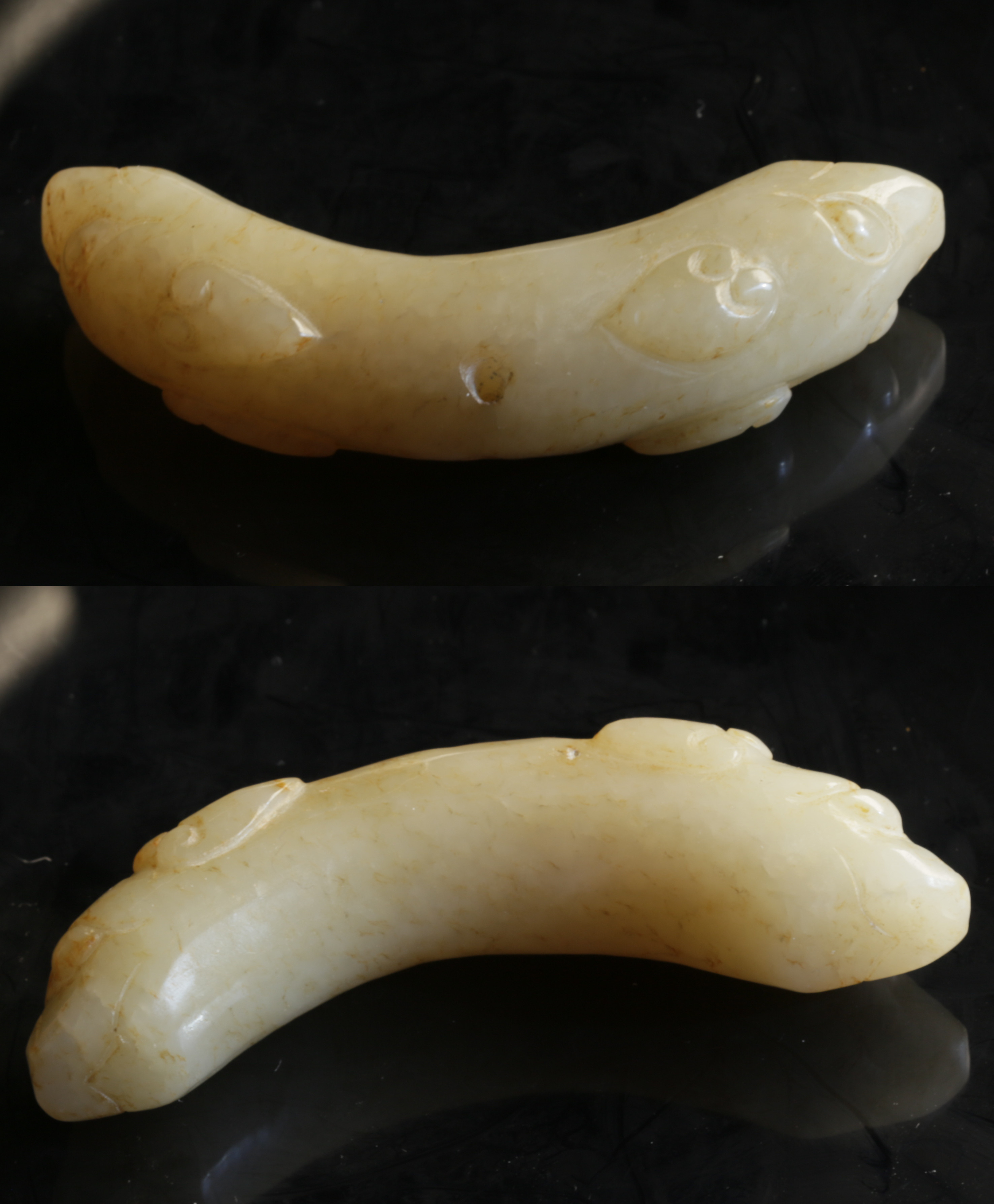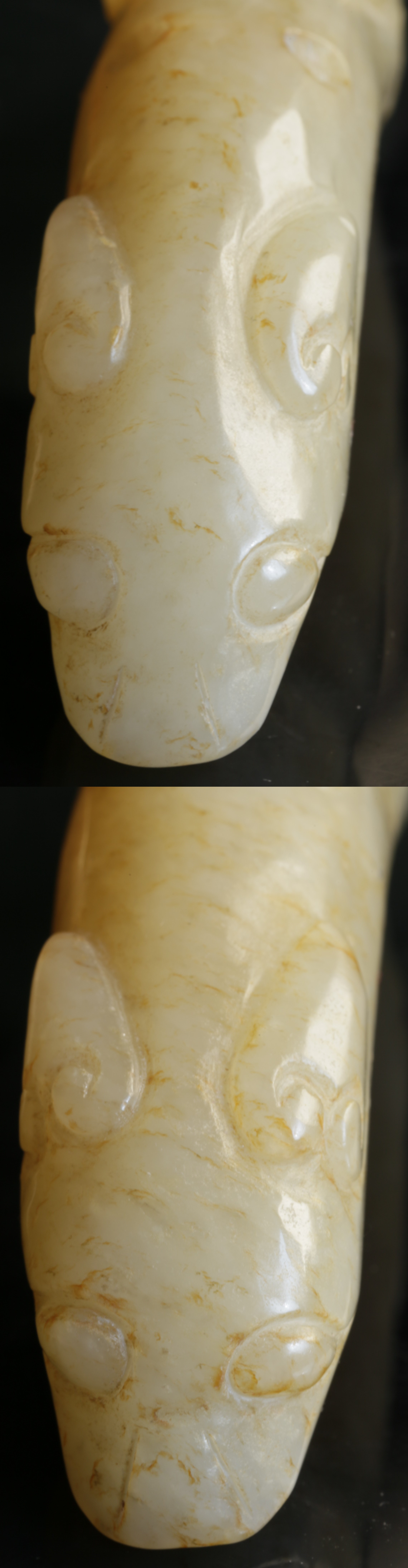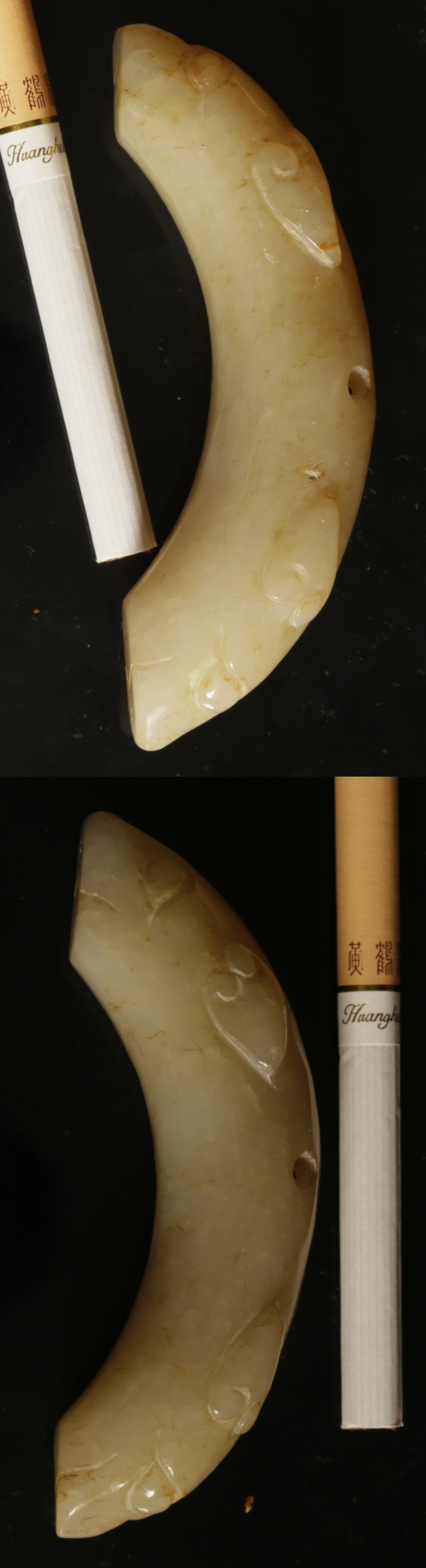 红山文化 . 白玉双头龙玉饰品一个(第2件)尺寸:重76克。长87.7MM,厚20.6MM,宽38MM。品相:完美全品,无任何裂绺。红山文化位于辽宁西部,是中国已知出现最早的文明,距今五千多年。红山文化的范围比较广泛,几乎囊括了北方大部分地区,主要分布在河北北部、辽宁西部大凌河与西辽河上游。1921年红山文化遗存被发现,1956年,正式命名为红山文化。红山文化拥有较高的玉雕工艺水准,玉器多为磨制加工而成。此件玉雕较厚,近于圆雕卡通熊首,面部刮琢轻浅,不追求高棱深凹的强烈对比效果,但其刮琢、磨制的痕迹有较明显的红山玉雕特征。此乃是白玉,千年古玉变秋黄,此玉是古代老坑岫岩河磨籽玉白玉雕琢而成,岫岩河磨籽玉非常好,此玉种已绝迹,这种古代老坑岫岩河磨籽玉比和田玉还要好,其硬度、润度、细腻度、滋润、密度、料性都超过现在的新疆和田玉仔玉,只是岫岩河磨料老坑白籽玉自汉代后就已绝迹,后来,在汉代以后,才广泛使用和田玉,用和田玉代替古代老坑岫岩河磨籽玉,所以买家不要误会此玉种差,此玉种玉质好,比和田玉还好,内行都懂这个道理的。此是精品出*土*高古玉,“白玉双头龙玉饰品”玉质纯净、无棉无杂,沁色漂亮,包浆浑厚,润级了,完美全品。此是开门*的*高古玉, 红山文化期的古玉、很少有这么好的玉料玉质的,一般*出*土*古*玉的玉质都差沁重,很多红山古玉都黑不溜秋的,很多馆藏红山古玉也没几个好玉质的,此乃红山文化期古玉精品。此乃玩红山古玉梦寐之器。这件雕工极美,款式好,大,沁入骨、土沁成糖色,可不是俄料仿古,是土沁之色成这样,他的沁、灰皮、型、工都一眼开门的*出**土*红山文化期古玉,是古代老坑岫岩河磨籽玉白玉雕的,玉质很硬。能滑动玻璃,雕工细致入微,非常耐看,包老包真古玉,此玉的工痕明显能看出是纯手工老工,东西非常开门,老土沁似糖,注意区分,玉质油润,雕工精悍叹为观止。极其罕见。这件是籽玉后入*土*沁成这样的,此不是地方玉雕的,玉质很硬,能滑动玻璃。沁色自然入骨,包浆浑厚,玉质很白黄,玉质级温润,多和此物交流多盘,玉质更润,注意有的照片玉后有香烟对比白度,玉内结构内有沁黑沙点,这件是开门高古玉佩饰,这件玉雕“白玉双头龙玉饰品”非常漂亮。盘养出来更漂亮,内藻丝纹入骨入到玉结构内了,内藻丝也漂亮,不伤大雅,反增美感!照片两面都照了,细心买家注意看玉表沁能区分正反两面。此类的红山文化“白玉双头龙玉饰品”玉雕,珍贵而罕见。是不可多得的精品,具有极高的收藏价值。该玉可出和田玉证书!
