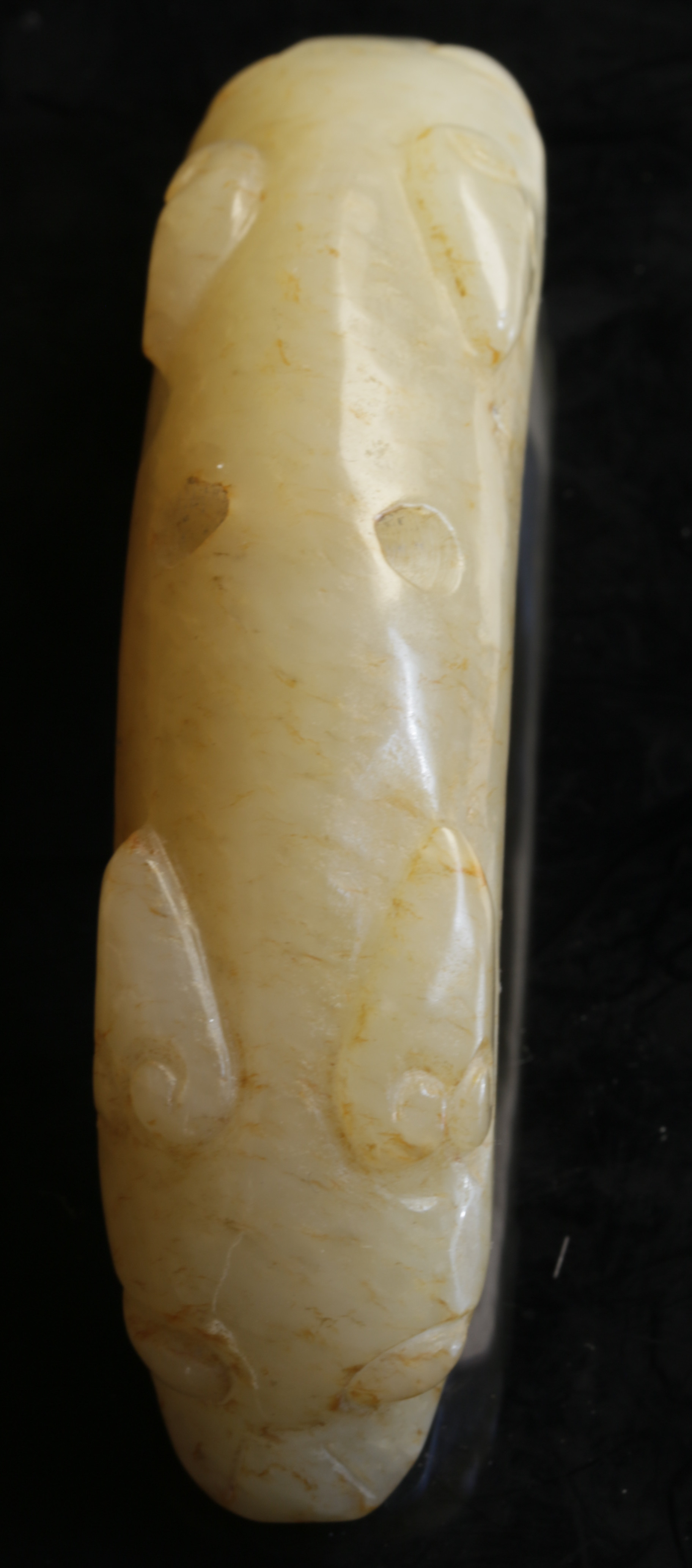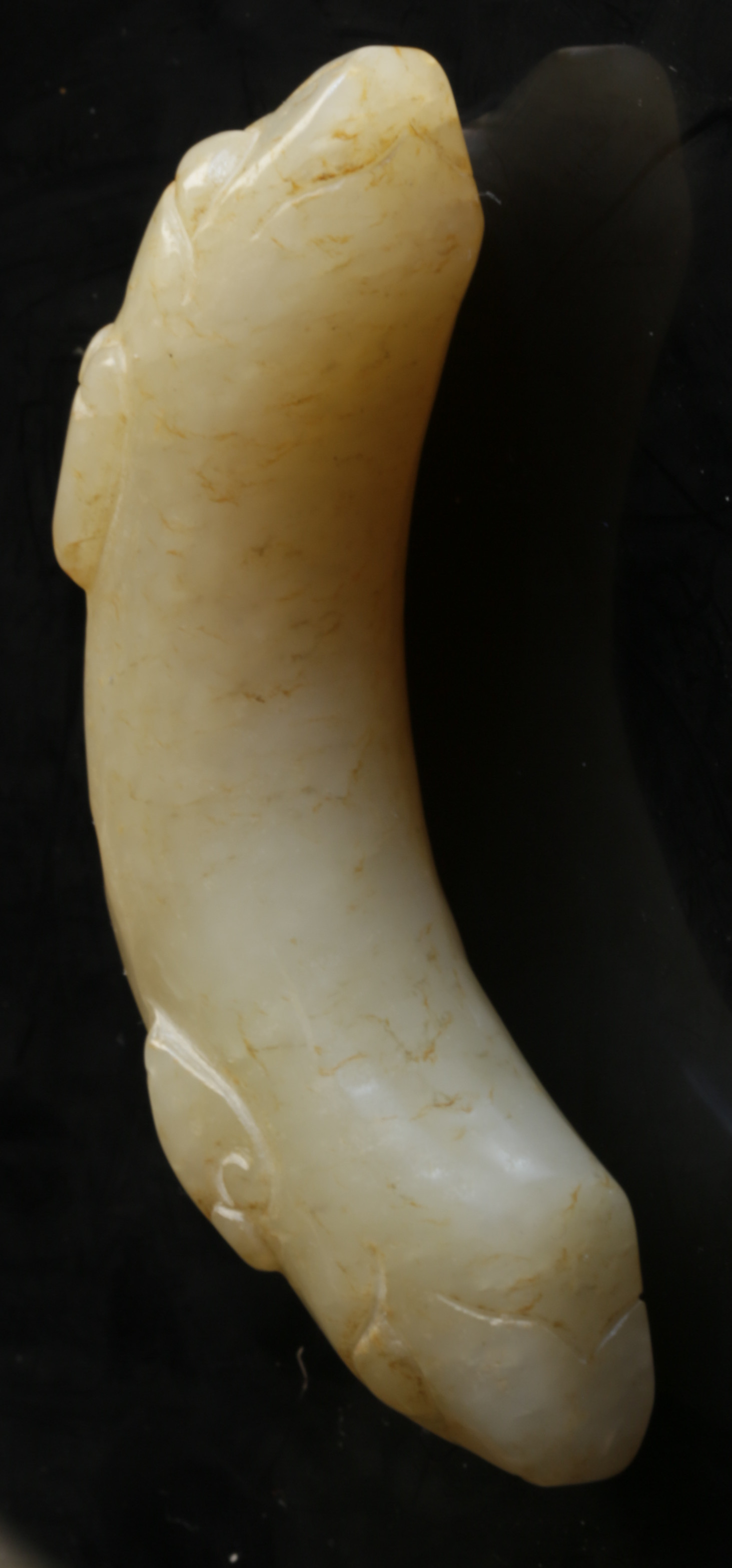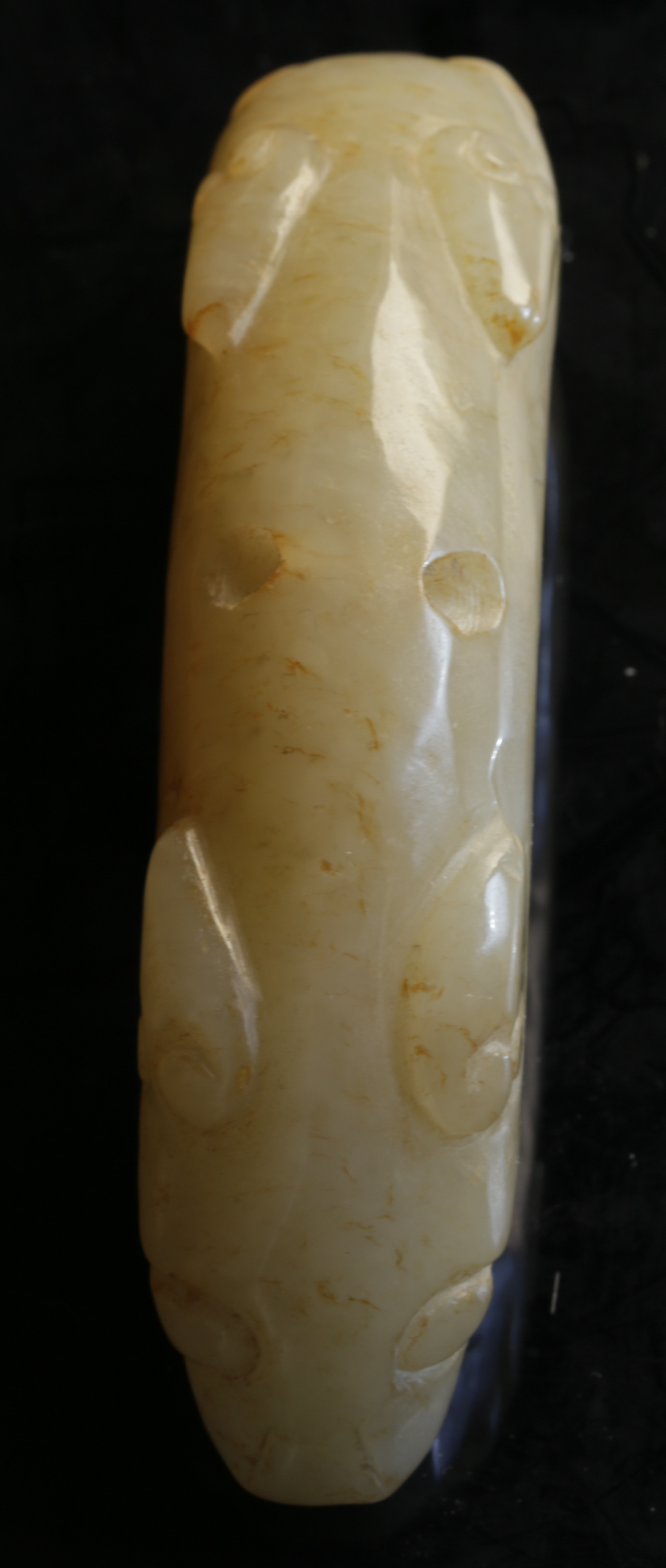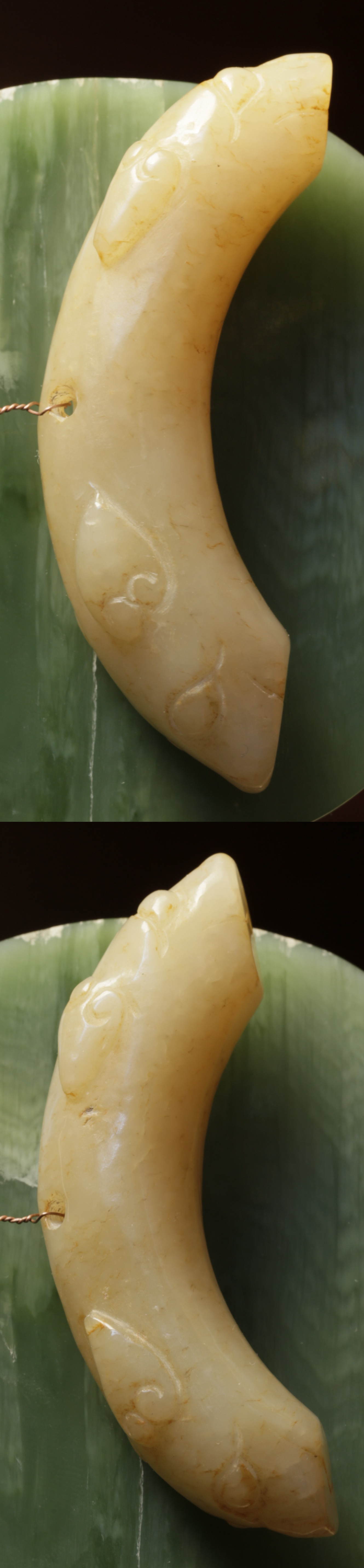 红山文化 . 白玉双头龙玉饰品一个(第2件)尺寸:重76克。长87.7MM,厚20.6MM,宽38MM。品相:完美全品,无任何裂绺。红山文化位于辽宁西部,是中国已知出现最早的文明,距今五千多年。红山文化的范围比较广泛,几乎囊括了北方大部分地区,主要分布在河北北部、辽宁西部大凌河与西辽河上游。1921年红山文化遗存被发现,1956年,正式命名为红山文化。红山文化拥有较高的玉雕工艺水准,玉器多为磨制加工而成。此件玉雕较厚,近于圆雕卡通熊首,面部刮琢轻浅,不追求高棱深凹的强烈对比效果,但其刮琢、磨制的痕迹有较明显的红山玉雕特征。此乃是白玉,千年古玉变秋黄,此玉是古代老坑岫岩河磨籽玉白玉雕琢而成,岫岩河磨籽玉非常好,此玉种已绝迹,这种古代老坑岫岩河磨籽玉比和田玉还要好,其硬度、润度、细腻度、滋润、密度、料性都超过现在的新疆和田玉仔玉,只是岫岩河磨料老坑白籽玉自汉代后就已绝迹,后来,在汉代以后,才广泛使用和田玉,用和田玉代替古代老坑岫岩河磨籽玉,所以买家不要误会此玉种差,此玉种玉质好,比和田玉还好,内行都懂这个道理的。此是精品出*土*高古玉,“白玉双头龙玉饰品”玉质纯净、无棉无杂,沁色漂亮,包浆浑厚,润级了,完美全品。此是开门*的*高古玉, 红山文化期的古玉、很少有这么好的玉料玉质的,一般*出*土*古*玉的玉质都差沁重,很多红山古玉都黑不溜秋的,很多馆藏红山古玉也没几个好玉质的,此乃红山文化期古玉精品。此乃玩红山古玉梦寐之器。这件雕工极美,款式好,大,沁入骨、土沁成糖色,可不是俄料仿古,是土沁之色成这样,他的沁、灰皮、型、工都一眼开门的*出**土*红山文化期古玉,是古代老坑岫岩河磨籽玉白玉雕的,玉质很硬。能滑动玻璃,雕工细致入微,非常耐看,包老包真古玉,此玉的工痕明显能看出是纯手工老工,东西非常开门,老土沁似糖,注意区分,玉质油润,雕工精悍叹为观止。极其罕见。这件是籽玉后入*土*沁成这样的,此不是地方玉雕的,玉质很硬,能滑动玻璃。沁色自然入骨,包浆浑厚,玉质很白黄,玉质级温润,多和此物交流多盘,玉质更润,注意有的照片玉后有香烟对比白度,玉内结构内有沁黑沙点,这件是开门高古玉佩饰,这件玉雕“白玉双头龙玉饰品”非常漂亮。盘养出来更漂亮,内藻丝纹入骨入到玉结构内了,内藻丝也漂亮,不伤大雅,反增美感!照片两面都照了,细心买家注意看玉表沁能区分正反两面。此类的红山文化“白玉双头龙玉饰品”玉雕,珍贵而罕见。是不可多得的精品,具有极高的收藏价值。该玉可出和田玉证书!