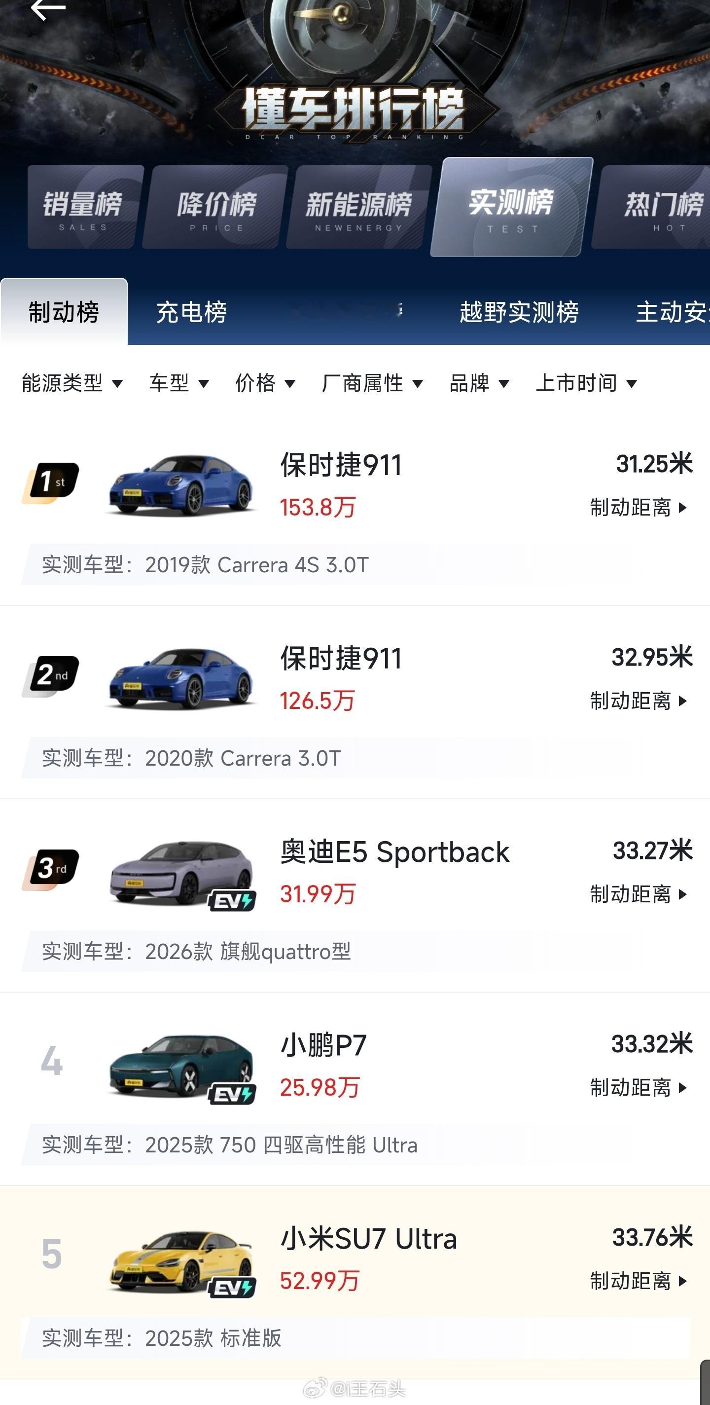 “200km/h瞬间刹停”是雷军介绍SU7 Ultra刹车性能时用的说法,但是时间久了,断章取义多了,就变味了。当时雷军是想突出刹车特别牛,结果被歪曲抹黑,“瞬间”被解读成0.01秒。但问题是,小学语文什么时候禁止使用修辞手法了?什么时候禁用形容词了?我只能说,这些人上小学的时候肯定是语文没及格过,就觉得“瞬间”就是几秒的事儿。有个词叫“百年瞬间”,这个我就不多说了,感兴趣的可以自己去搜一下。那小米SU7 Ultra真实的刹车表现到底怎么样?小米官方数据是百公里刹停33.3米,懂车帝实测下来是33.76米,在所有实测车型中排名第五,基本是百万级性能车的水准。所以这能叫虚假宣传吗?但凡有台手机、有台电脑,稍微用手指打打键盘,就能看到实测数据搞清楚事实。说到底,有些人不是蠢,就是懒,懒得查证,只是一味地跟风吐槽,还带着一股莫名的傲慢。不分是非、不讲事实,那才真叫可笑、无知。