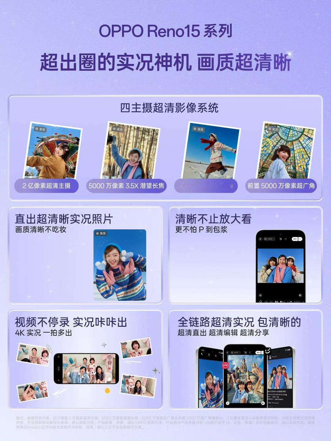 实况依旧是 Reno15 系列的强项,4K 视频,4K 实况,支持美图秀秀超清实况编辑、超清 4K 实况分享某书, 系列带来帧帧超清透的实况人像效果,采用全新的Natural Tone实况引擎。不仅出片肤质细腻柔和,还原气血感,且从封面帧到视频段,色彩更一致,帧帧都好看。