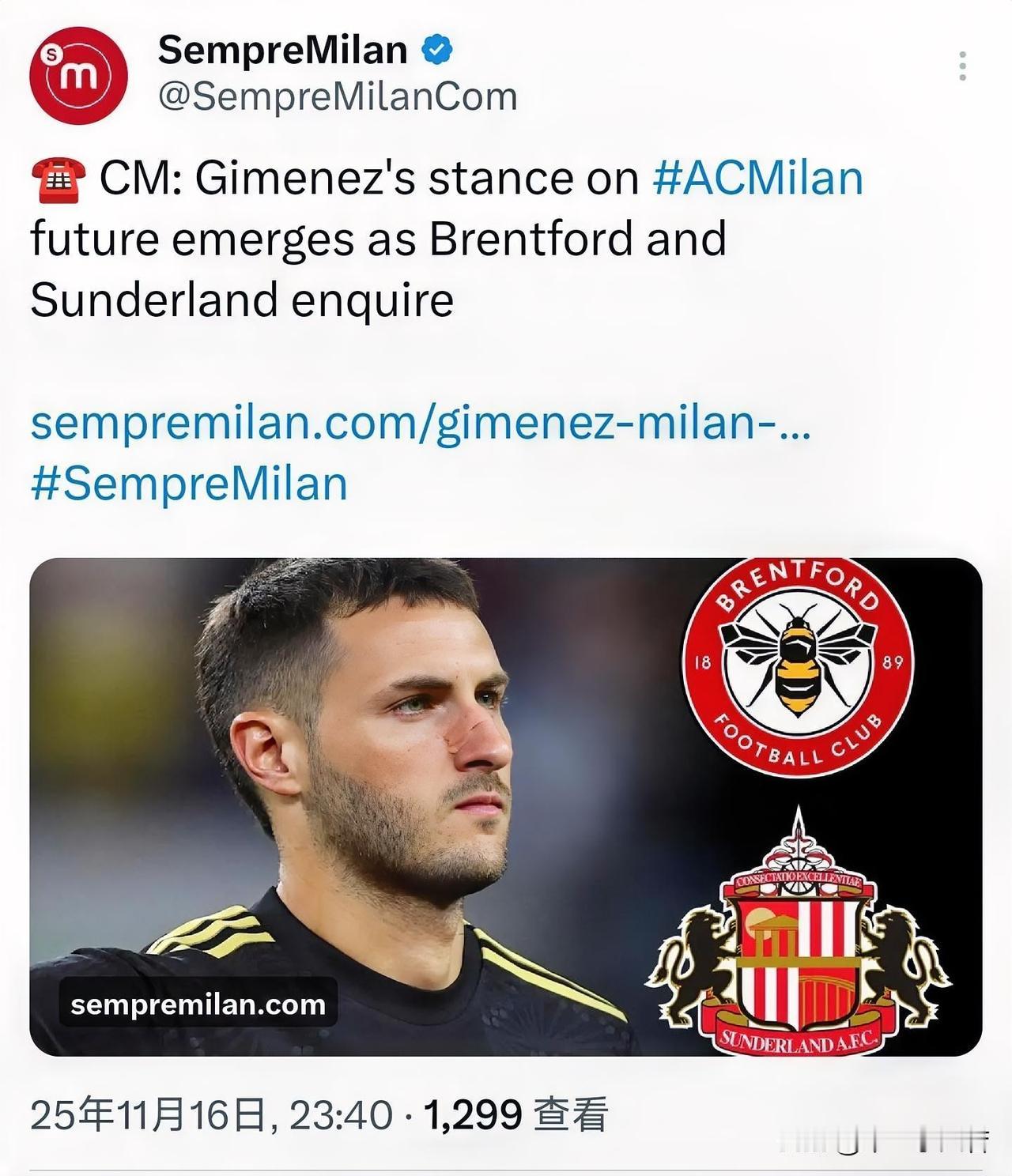 英超布伦特福德和桑德兰俱乐部对米兰前锋希门尼斯充满兴趣,他们期望把希门尼斯作为冬