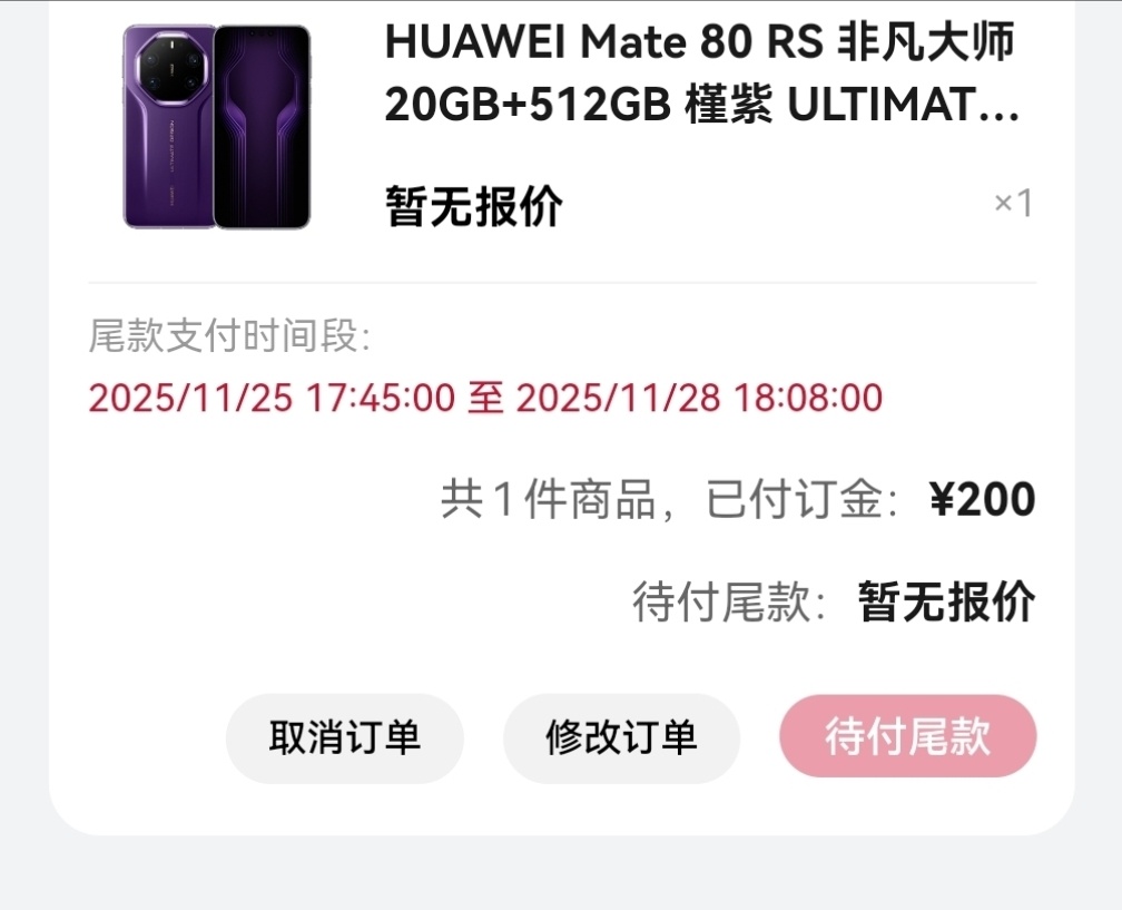 嘻嘻订到了一台瑾紫色的华为 Mate 80 RS 非凡大师,20+512 的版本,一人只能买一台当我想起来用美丽的手机再订一台的时候,已经没货了