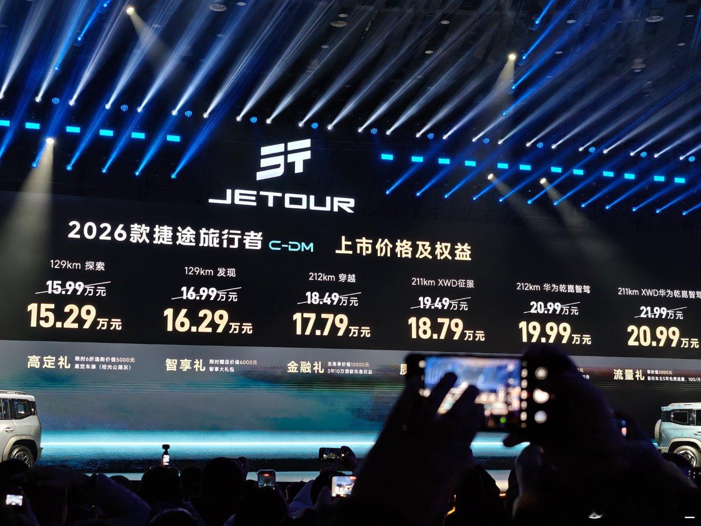 来2026款旅行者双车上市发布会了作为捷途品牌,非常重要的一款SUV捷途旅行者、旅行者C-DM今晚正式上市限时焕新价旅行者5个版型,12.49——16.49w旅行者C-DM 6个版型,15.29——20.99w🍔坚持旅行+的战略不动摇捷途是全球最快七年两百万销量达成的品牌设计部分,两款新的轮毂座舱加入实体物理按键,水晶飞行档把整个座舱的舒适度,静谧性也都有提升5A的健康座舱里面像女王副驾、二排小桌板、车载冰箱也都有尾箱还有开瓶器、智能灯语小书包🍔聊回来XWD这套全自动智能四驱响应快、操控稳、超耐久、易于上手配合7+X的驾驶模式,越野小白能更轻松了动力部分最大功率187kW、最大扭矩390Nm🍔来到旅行者C-DM有了华为乾崑智驾ADS4、宁德时代电池值得一提的是把激光雷达做到了舱内动力部分系统功率455kW、920Nm的系统扭矩🍔这样的捷途旅行者,你们觉得怎么样?