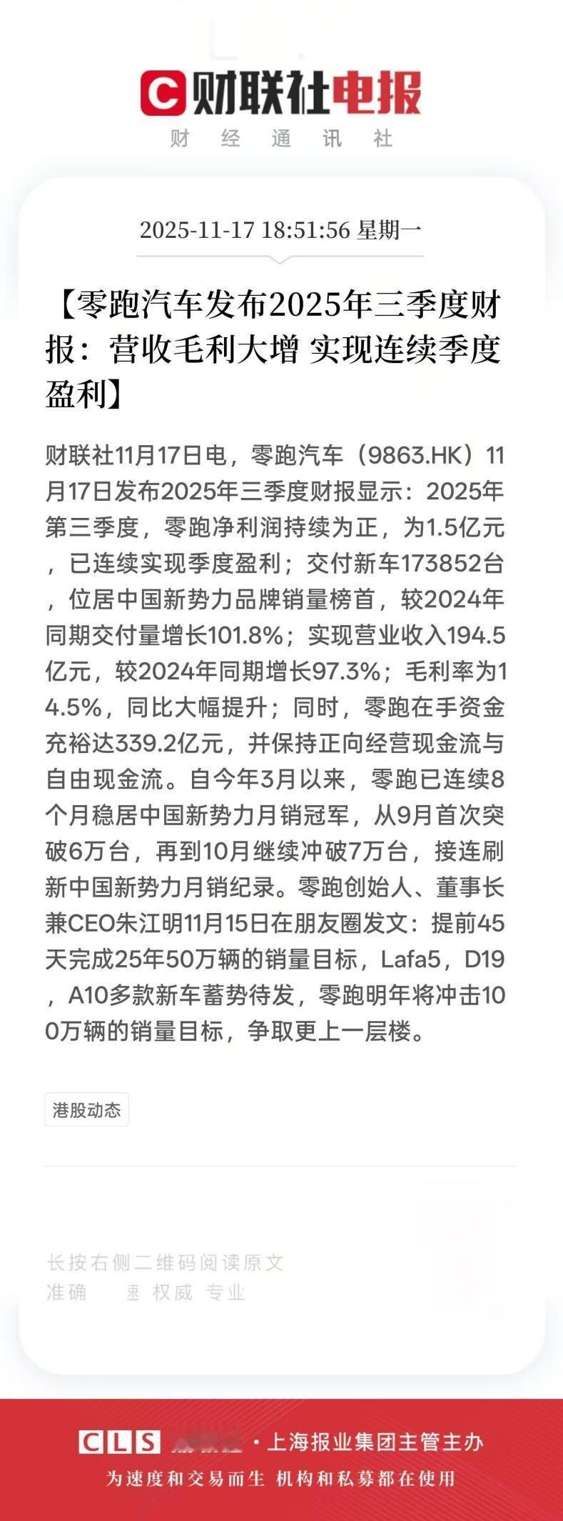 财报、销量全在刷纪录,零跑汽车太稳了。 单季度交付173852台、营收超194.5亿元,零跑这份打破品牌纪录的三季度财报,应该让不少友商惊出一身冷汗。而且不光卖得好,依靠规模效应的扩大,还有产品组合优化与持续成本管理等措施,零跑的毛利率已经来到了14.5%,并以超亿元净利润实现连续季度盈利,整体经营不断向好。 值得一提的是,零跑的向好势头进入四季度仍得到了保持。在10月,零跑以超7万台创造了新势力月销新纪录,算上5万+的8月、6万+的9月,已是连续三个月改写这项纪录,并最终在几天前提前完成50万台销量目标,顺带又刷了一项纪录。 能看到的是,零跑现在是新兵、“老将”都给力。像已经连续畅销4年、实现约30万台累计交付的C11,至今仍是零跑最受欢迎的产品之一,并在中型SUV市场担任着品牌销量担当。C11所依靠的就是用15-20万级的实际售价带来30-40万级的豪华体验,理想同款8295芯片、奔驰同源PSS豪华音响,还有豪车用的前双后五悬架等等均是如此。 据悉,零跑当前还提供了至高9000元的品牌置换补贴,并赠送充电桩与整车终身免费质保,卖得这么好了还那么大的优惠,诚意满满,最近在犹豫的朋友可得抓紧时间下手了。