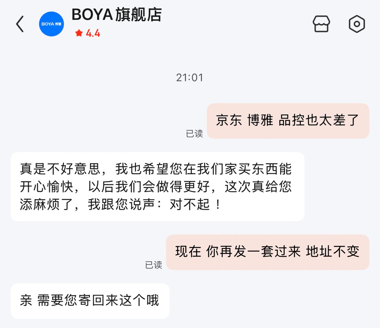 京东真的越用越让人糟心,服务服务做不好,品控更不用说了差的不能在差。怪不得人人叫你二手东。jd新买的博雅麦克风,录音卡顿、吞字。品牌客服也承认了是自家品控问题,我让他们赶紧再补发一台过来,我最近等着急用呢。 然后人家说要等他那边收到货检验没问题之后。再给我补发。真的没见过这么不作为的商家、平台。真心希望他们原地倒闭!