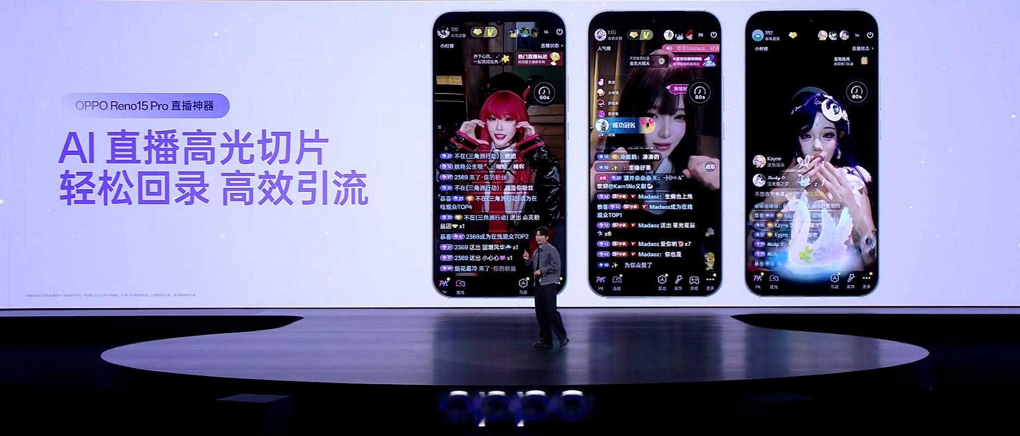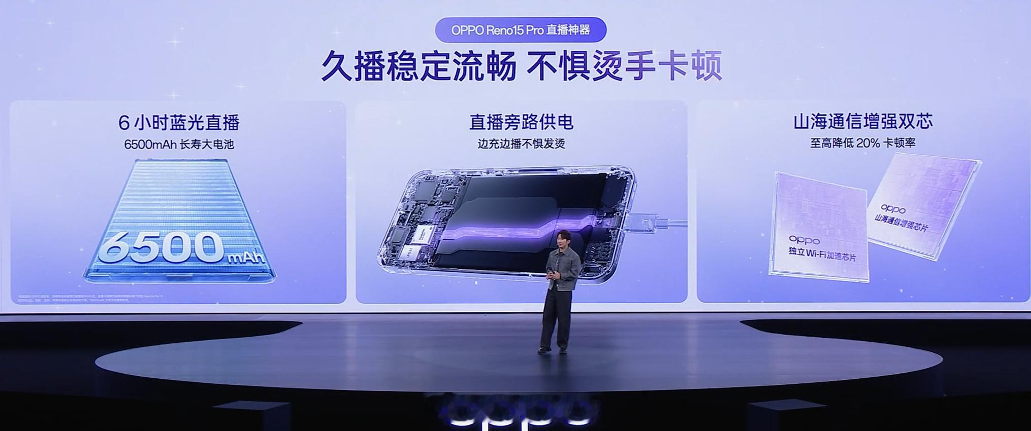OPPO Reno15 Pro 电池给到了 6500mAh,支持旁路供电,定位直播神器