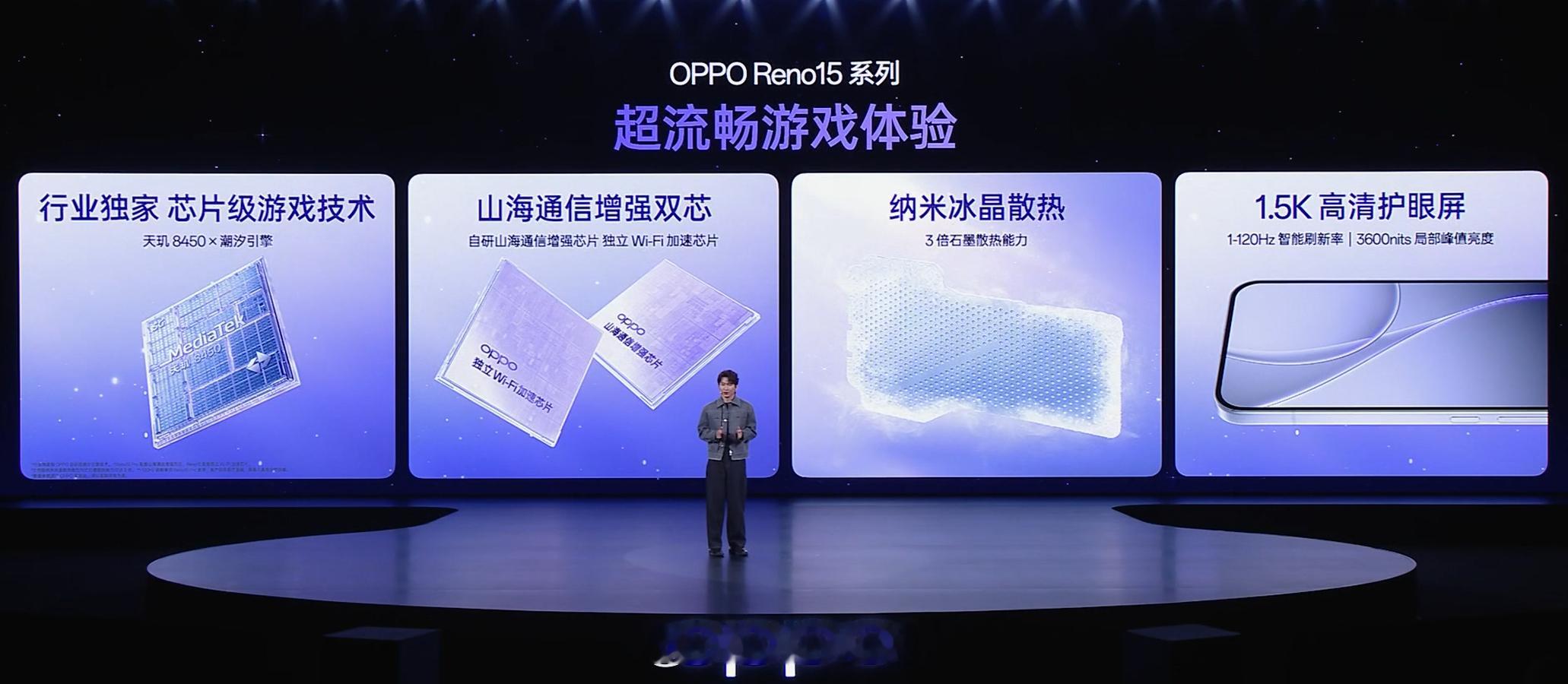 OPPO Reno15 系列配置:天玑 8450 处理器,自研山海通信增强芯片,纳米冰晶散热,1.5K 护眼屏,1-120Hz 刷新率,3600nits 局部峰值亮度,ColorOS 16。