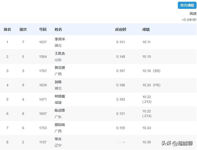 恭喜湖北队继男足夺冠以后又拿下一块份量极重的金牌,男子100米冠军!李泽洋今天的起跑太吃亏了,后程的实力真的可以,不然成绩还会更好,希望今后能有更大的突破。真不容易啊决赛全是00后!