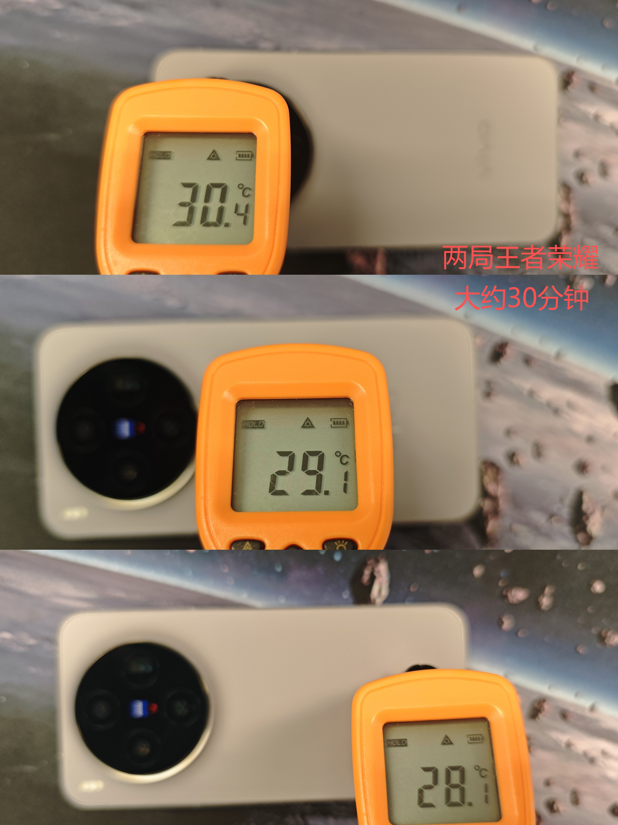 拍照好打游戏就散热差?纯属扯犊子!前段时间朋友想换新机,首要条件就是拍照好,我推荐了几款又说拍照好是不是打游戏的话散热就差?我一听,这不纯扯犊子呢吗?正好我手里有vivo X300,果断来一波~游戏前初始温度:摄像头、中、尾部区域温度分别是27.5℃、27.7℃、27.5℃温度变化:两局《王者荣耀》,温度分别是30.4℃、29.1℃、28.1℃;《和平精英》后分别是33.4℃、30.7℃、30.4℃;30分钟《原神》分别是31.6℃、31.5℃、31.2℃。从测试结果来看,作为主打影像的vivo X300在室温23℃下,连续1.5小时运行三款主流手游后,机身最高温度未超34℃,表现甚至好于很多主打电竞的游戏手机,整体温差控制稳定。顺便说下,vivo X300搭载的是联发科天玑9500,配合冰脉流体VC散热系统,真所谓“天玑调校看蓝厂”,实至名归!