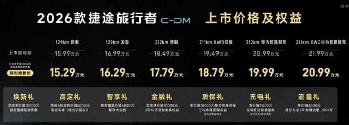 15.29-20.99万,新的捷途旅行者C-DM值吗? 教授觉得最低配的的129两个配置都“有点素”了,129km的续航加上国轩高科的电池,可以说是凑合用。特别是最低配,连一些象征味道很重的轮眉灯都省了,这一区间主要当油车用,非要二选一的话,那一定是16.29万的配置合适一些。212km两个版本里面,18.79万的配置戴上了XWD电四驱的配置比129km发现贵了2.5万,但多了一整套四驱系统+一些舒适配置,但对比17.79的212穿越来说,多出的四驱系统还是比较值的,捷途主要宣传的就是这套系统。需要智驾的话,那就在18.79万的配置上,多加2万块钱去选择顶配,主要多了8255芯片和全套智驾芯片,这个直接对标钛7,当然配置是比钛7的好,特别是有华为智驾的加持下,城市和高速更顺心。但如果你这个车子就是拿去野的,那么智驾就不是必须的了,教授觉得符合这个价位的定价,不过品牌力还是比钛7低一些。 下面是参数: 基础参数:4795*2006*1880mm,轴距:2800mm(中型SUV) 驱动形式:插电混动四驱 CLTC续航:129-212km 电池类型:磷酸铁锂 电池容量:27.2(国轩高科)-43.24kWh(宁德时代) 发动机:1.5T 发动机功率:115kW 电机功率:165kW 悬架:前麦弗逊后多连杆 显示:10.25液晶仪表 车机芯片:高通8155/8255 辅助智驾:华为 ADS 4 外观:黑/银/灰/白/蓝 内饰:黑红/灰米 其他配置:540全景影像 15.29万 129 探索 前驱/19 HT轮胎/电吸尾门/外后视镜折叠加热 8155芯片/LED前后灯+行车灯+光影格栅+自动远近光 皮座椅+主副驾电调+副驾腿托/8扬声器 16.29万 129 发现 L2+APA/2毫米波+12超声波+5摄像头/涉水感应/全景天窗 方向盘加热/50w快充/LED前雾灯+轮眉灯+九宫格灯 主副驾加热通风+主按摩 17.79万 212 穿越 前驱/主副驾电调+腰托/12 SONY扬声器/后排石英玻璃 18.79万 211 XWD 征服 电四驱/坦克转向+后差速锁+CCO蠕行 黑色磨毛顶棚/前排睡眠枕/PM2.5净化 主副驾磁吸+副驾小桌板 19.99万 212 华为乾崑智驾 8255芯片 前驱/1激光雷达+3*4D毫米波+12超声波+11摄像头/高快+城区NOA 20.99万 211 XWD 华为乾崑智驾 电四驱/坦克转向+后差速锁+CCO蠕行 扶手冰箱【来自懂车帝车友圈】
