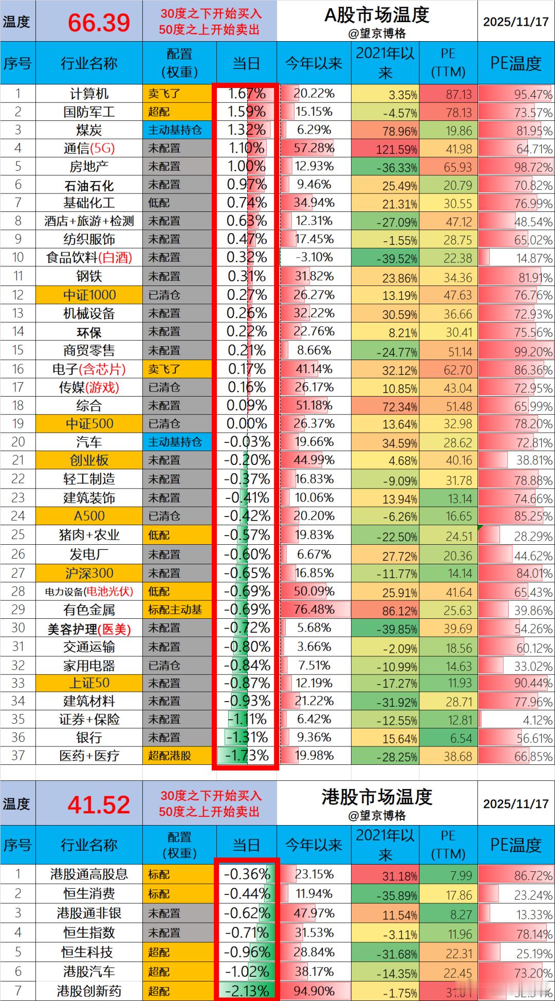 今天净值出来了。场内ETF账户亏损2.0万(资产260万);场外基金账户亏损4.0万(资产560万);两个账户合亏损6.0万,现在赚钱太难了。今天盘中折价买入20万巴西ETF,也算多元投资吧。几个月前,博格参加一个策略会,有专家提到:巴西为抑制通胀把基准利率提高到了15%(PS:嗯,没有看错,不是1.5%而是15%)。博格又去查了一下,巴西股票指数的市盈率为10倍,股息率5.47%。考虑到人家巴西基准利率为15%,也就是存款利率至少是每年15%了,估计巴西人也没啥动力炒股了。巴西基准利率处于近20年来的最高水平,如果未来持续降息的话,对于巴西股市算也是利好不断了。再瞅瞅指数的成分股有一半是资源类公司,或将受益于未来全球的货币宽松吧,按这个逻辑巴西指数还是值得尝试一下的。巴西IBOVESPA指数前五大成分股:(1)巴西百达投资银行(BTG Pactual)总市值740亿美元,是拉丁美洲最大的投资银行,总部位于巴西(2)巴西淡水河谷公司(Companhia Vale do Rio Doce,简称:Vale)总市值560亿美元,成立于1942年6月1日,总部位于巴西里约热内卢,该公司是全球最大的铁矿石生产和出口商,铁矿石年产量占巴西全国总产量的80%,主要矿区分布在"铁四角"地区和巴拉州,保有铁矿储量约40亿吨。(3)巴西国家石油公司总市值488亿美元,成立于1953年10月3日,公司自1917年起主导国家石油工业的勘探、开发、生产及运输,现为巴西最大的综合性能源企业,业务涵盖石油勘探开发、炼化、运输及销售等领域。(4)安贝夫(AmBev)总市值404亿美元,是一家巴西酿酒公司,成立于1999年由巴西两大酿酒商合并而成。2004年与英特布鲁合并成立英博集团,后发展为百威英博集团,通过收购多国啤酒品牌成为全球最大啤酒商。(5)巴西威戈集团总市值356亿美元,是一家总部位于巴西圣卡塔琳娜州的电气电子设备制造商,主要产品包括电动机、发电机、变压器、变频器、电机启动器、齿轮箱、工业自动化系统等,业务覆盖基础设施、钢铁、造纸、油气、矿业等多个行业博格没有赶上巴西ETF的IPO,本来想着现在QDII额度这么紧张,巴西ETF(520870)上市应该溢价的。结果人家上市首日是溢价的,之后回调不少。图片今天早上一看都折价了(价格小于盘中净值IOPV),赶紧筹集资金买入了20万,等后面涨起来溢价了再卖,或许可以赚一笔小钱。但是未来能不能赚钱的真的不好说,大家可以等着看博格卖出的时候是赚是赔吧。A股今天66.39度港股今天42.52度。统计数据不易,大家点赞支持。